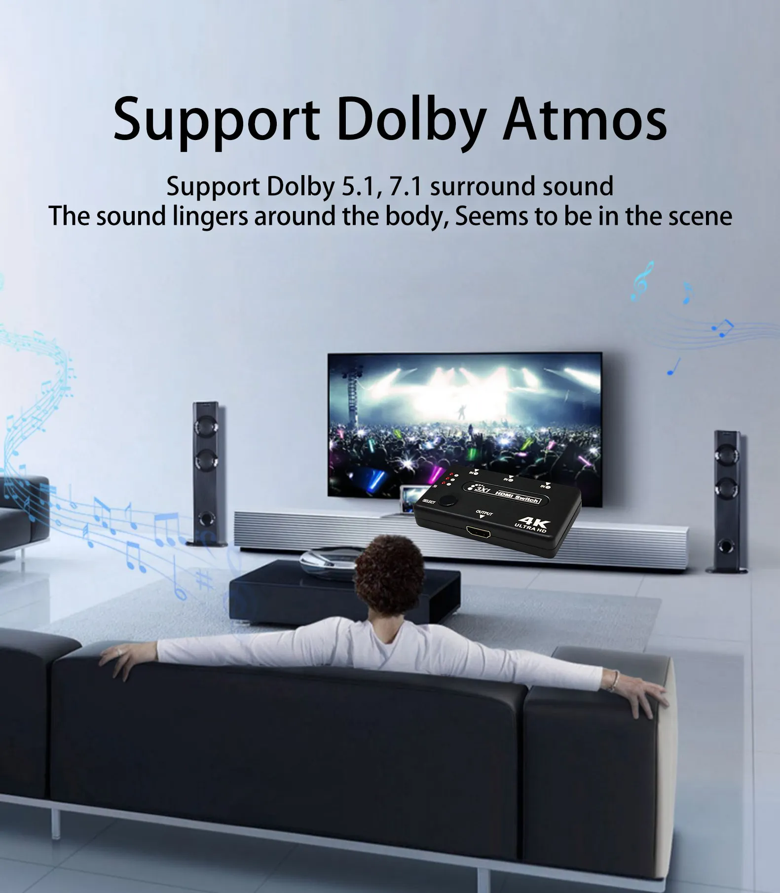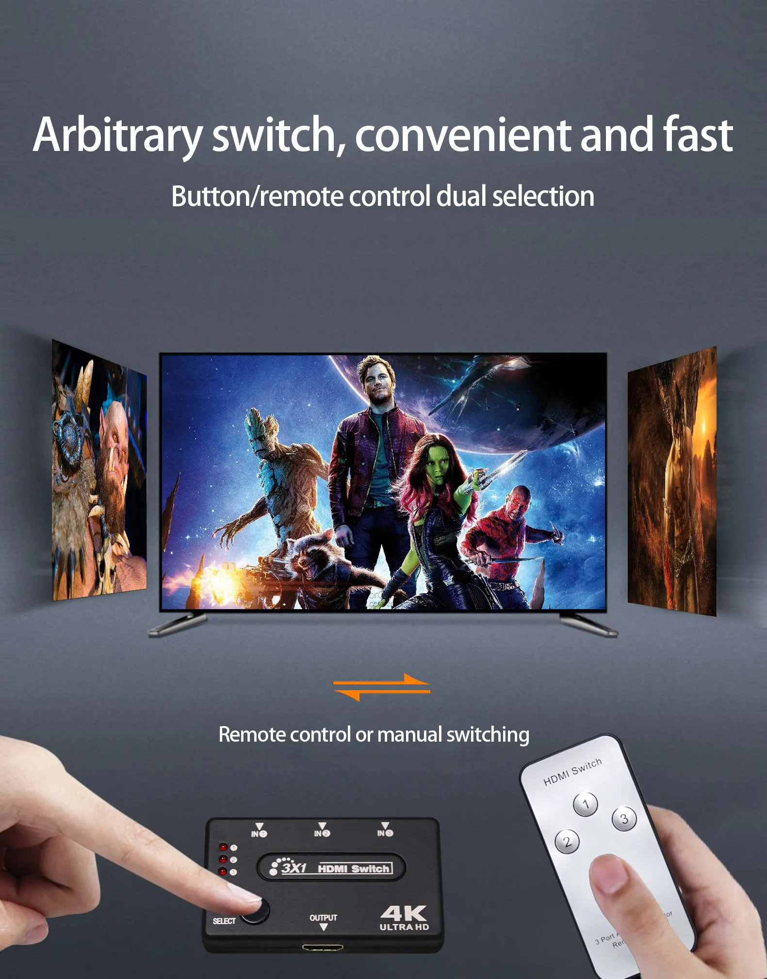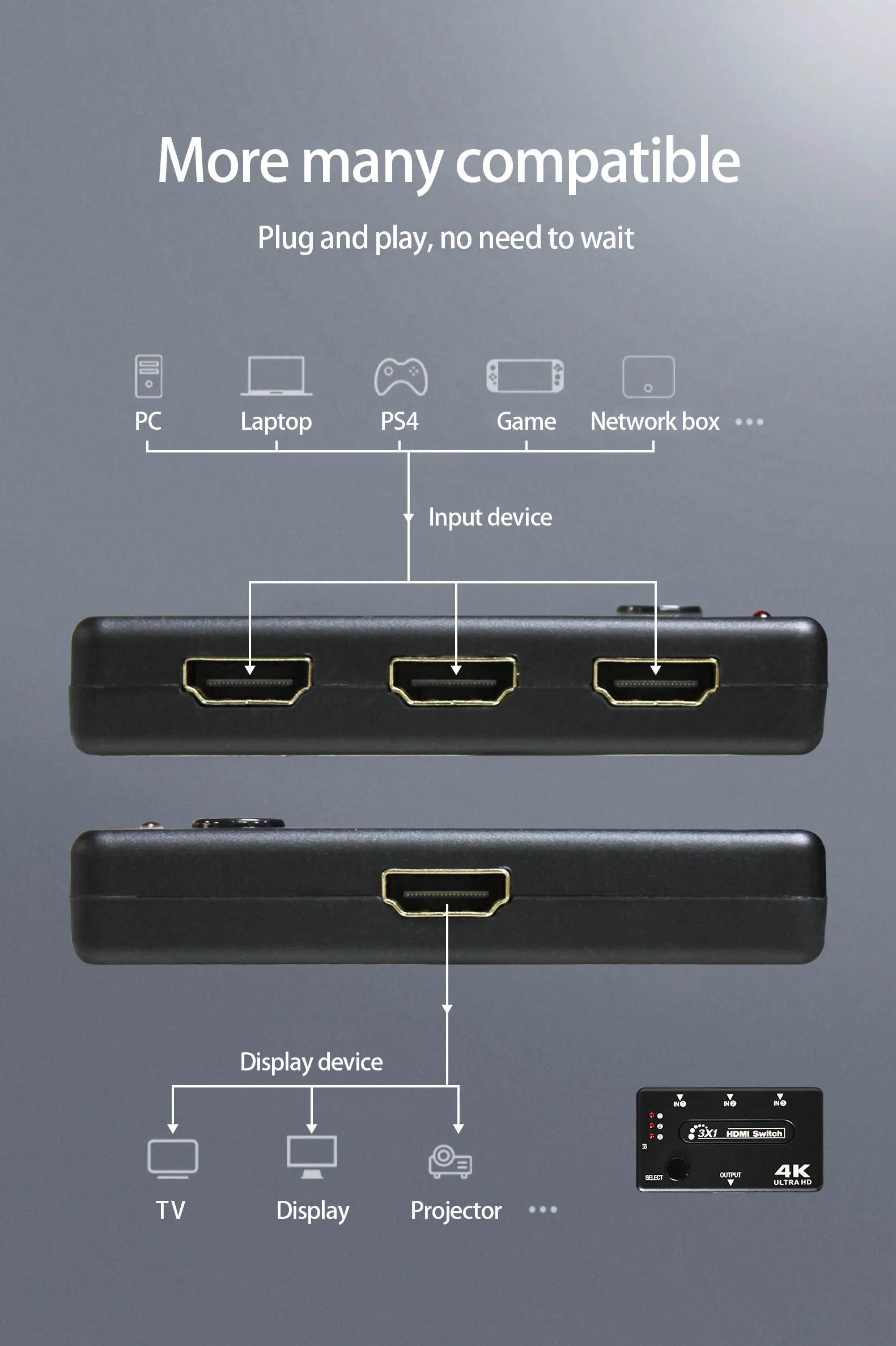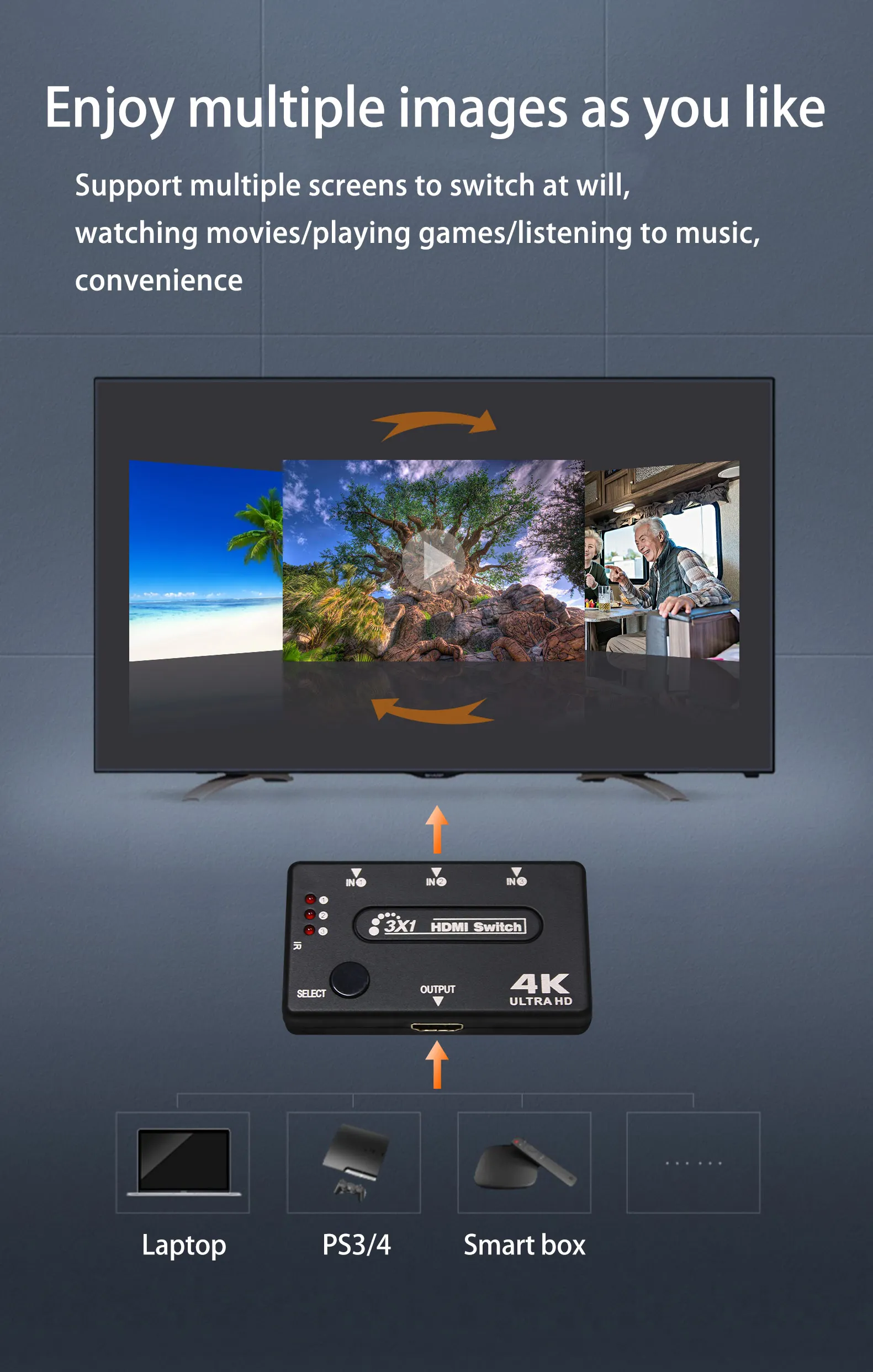 Set-top boxes, DVDs, game consoles, players and other devices do not need to be plugged in and out, and can support up to 3 inputs (note: one-to-one display, not simultaneous display)