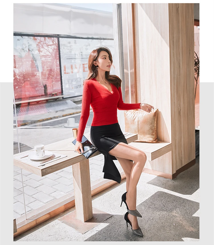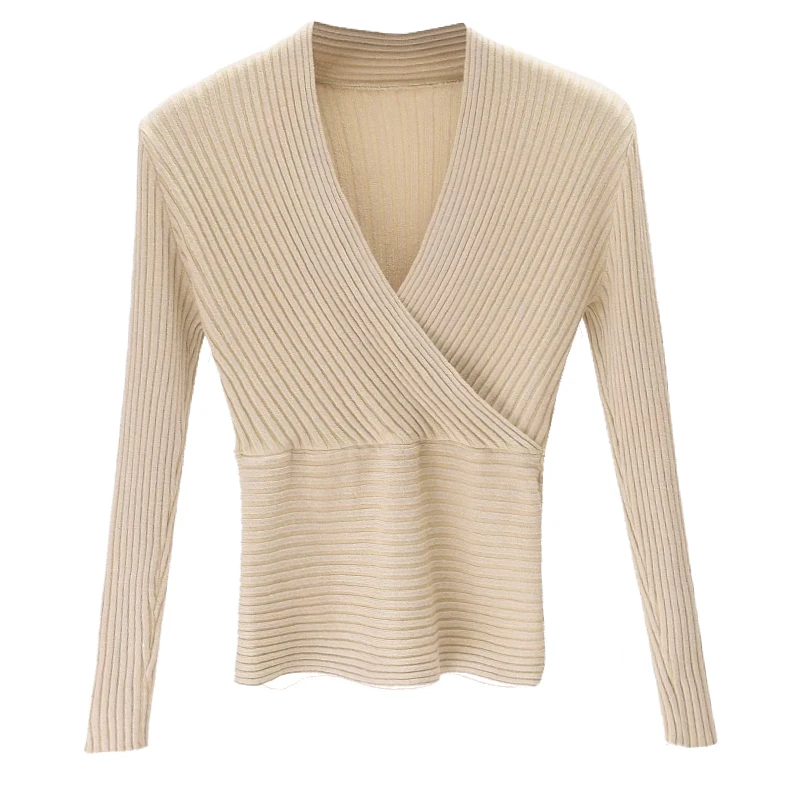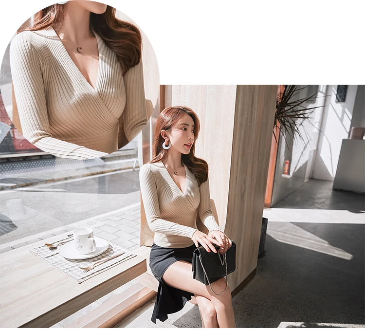 Корейский сексуальный свитер с глубоким v-образным вырезом Женский пуловер 2021 Повседневный тонкий джемпер женский эластичный хлопковый топ с длинным рукавом
