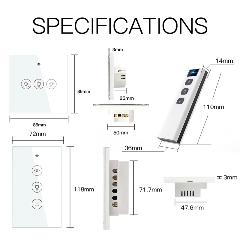 Основные характеристики: 1. 2/3-way multi-control association для управления 1 светильник с несколькими переключателями диммера; Панель из закаленного стекла с защитой от царапин подходит для любого домашнего декора и обеспечивает легкое сенсорное управление; вы можете связать этот переключатель с несколькими различными переключателями в приложении Smart Life. 2. Режим управления без помех; Позволяет управлять переключателем через умную жизнь, сенсорное управление, голос и пульт дистанционного управления с частотой RF433 и дистанционным переключателем кодирования 1527 (не входит в комплект); каждый метод управления работает независимо; Достичь мульти-контроля, связываясь с другими смарт-переключателями 3. Совместимость с Alexa и Google Home для бесконтактного голосового управления с 0%-100% регулируемой яркостью; Также можно управлять через приложение Smart Life/Tuya в любое время и в любом месте; настройка статуса реле и запоминание последнего статуса реле опционально при выключении, включение/выключение подсветки. 4. Возьмите полный контроль за подключенными приборами с таймером, расписанием и обратным отсчетом (1/5/30 минут, 1 час и т. д.) с приложением; Поделитесь контролем с семьей и друзьями для дополнительного удобства 5. Нейтральный провод не требуется; Поддерживает только 2,4 ГГц сети; Предлагает легче сопряжения через подключение по Wi-Fi и Bluetooth