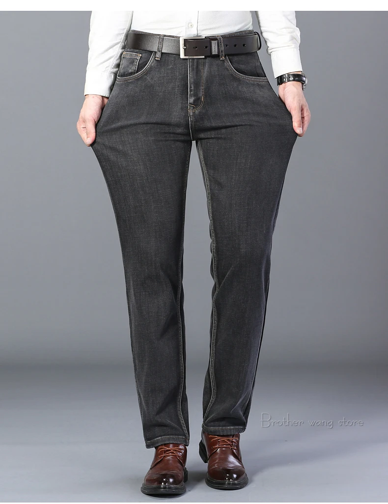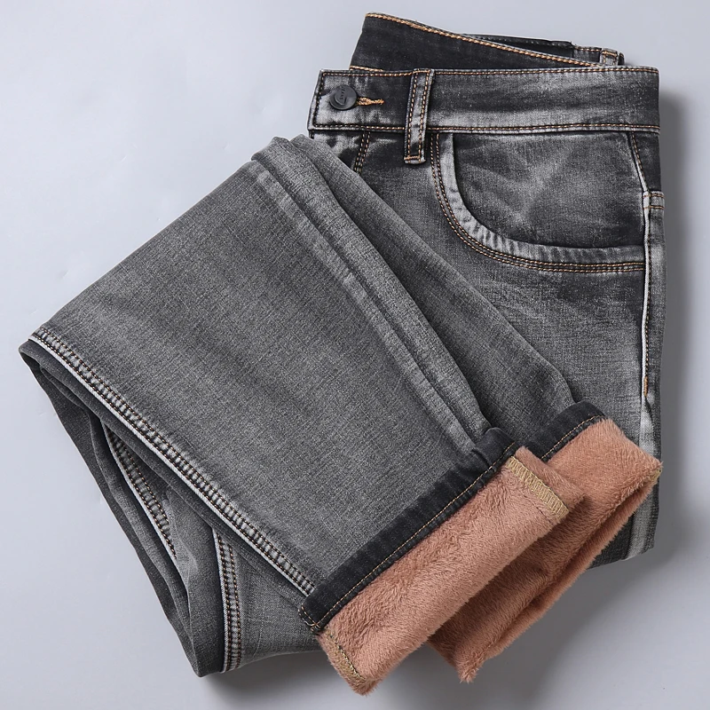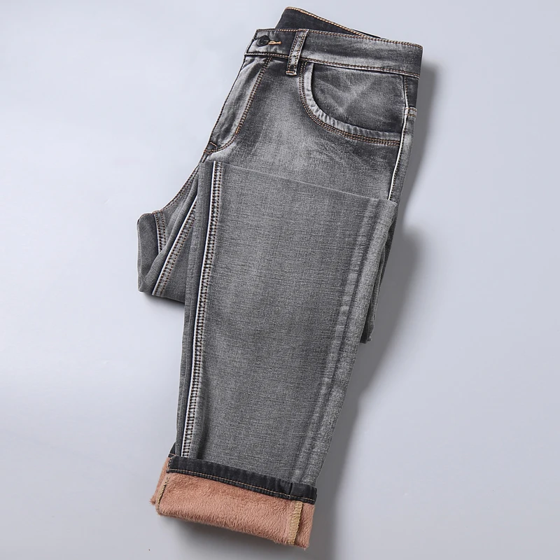 Мужские зимние теплые флисовые джинсы модные повседневные классические серые плотные Обычные прямые Стрейчевые джинсовые мужские Брендовые брюки