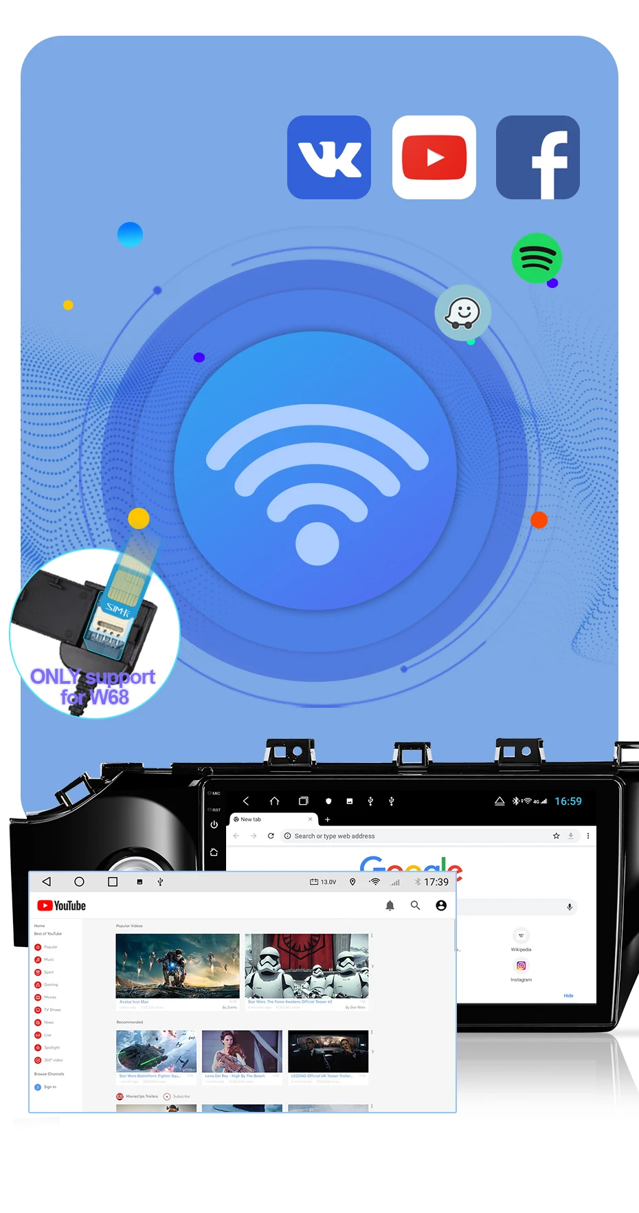 Пожалуйста, обратите внимание: только w68 поддерживает карту 4G>>> Подключите автомобильный радиоприемник к Wi-Fi и используйте его, как телефон, загрузите приложение из игрового магазина, которое вам нравится.