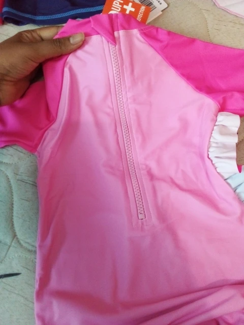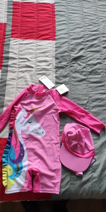 отличный костюм! пришел очень быстро, в подарок лежала резиночка для волос. дочке годик, рост 74см, заказала размер 90. подошло отлично! ждем августа чтобы опробовать на море.))