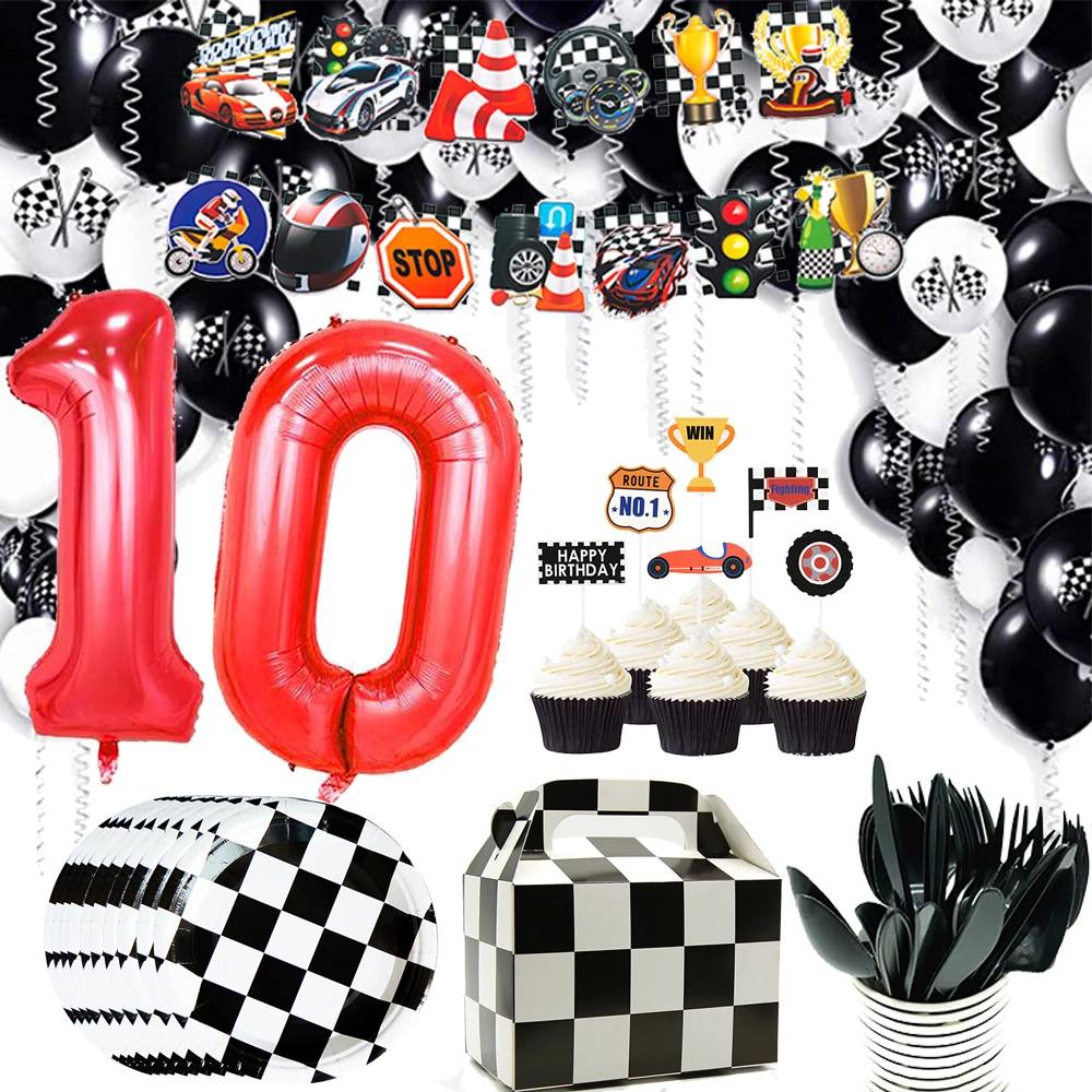 Гоночные автомобили вождения одноразовая посуда черный, белый цвет бумажный шарик пластины чашки Комплект салфеток вечеринка для мальчика день рождение украшения
