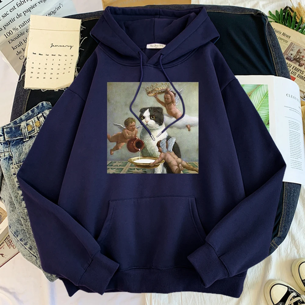 Толстовка с капюшоном с изображением маленького ангела и кота; Женская толстовка с капюшоном; Эстетическая Корейская одежда для пары; Теплые женские толстовки Harajuku