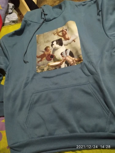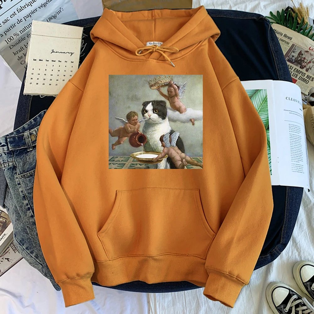Толстовка с капюшоном и принтом маленького ангела и кота, женская с капюшоном, эстетическая корейская одежда для пар, теплые женские толстовки в стиле Харадзюку