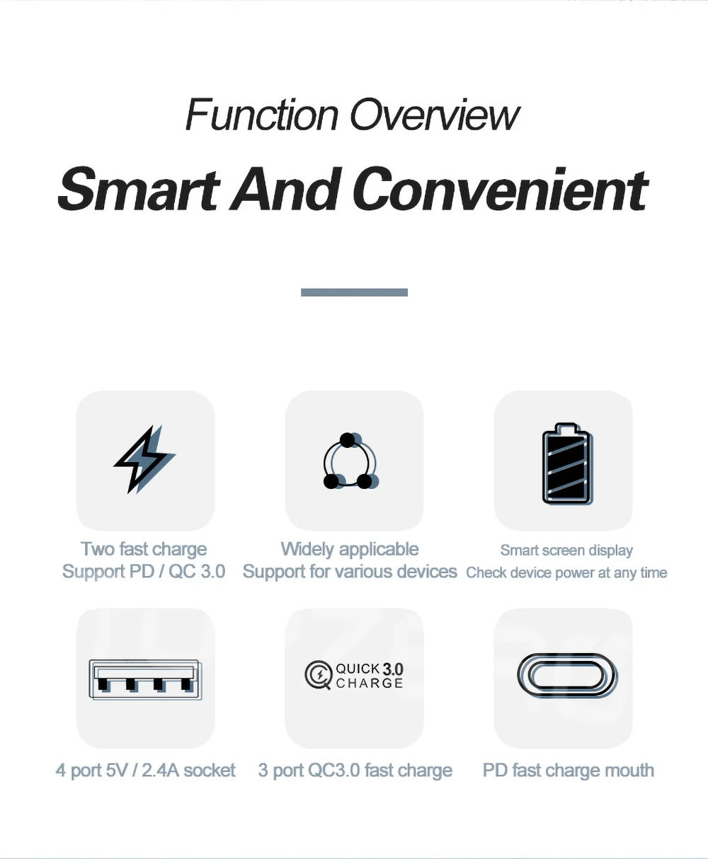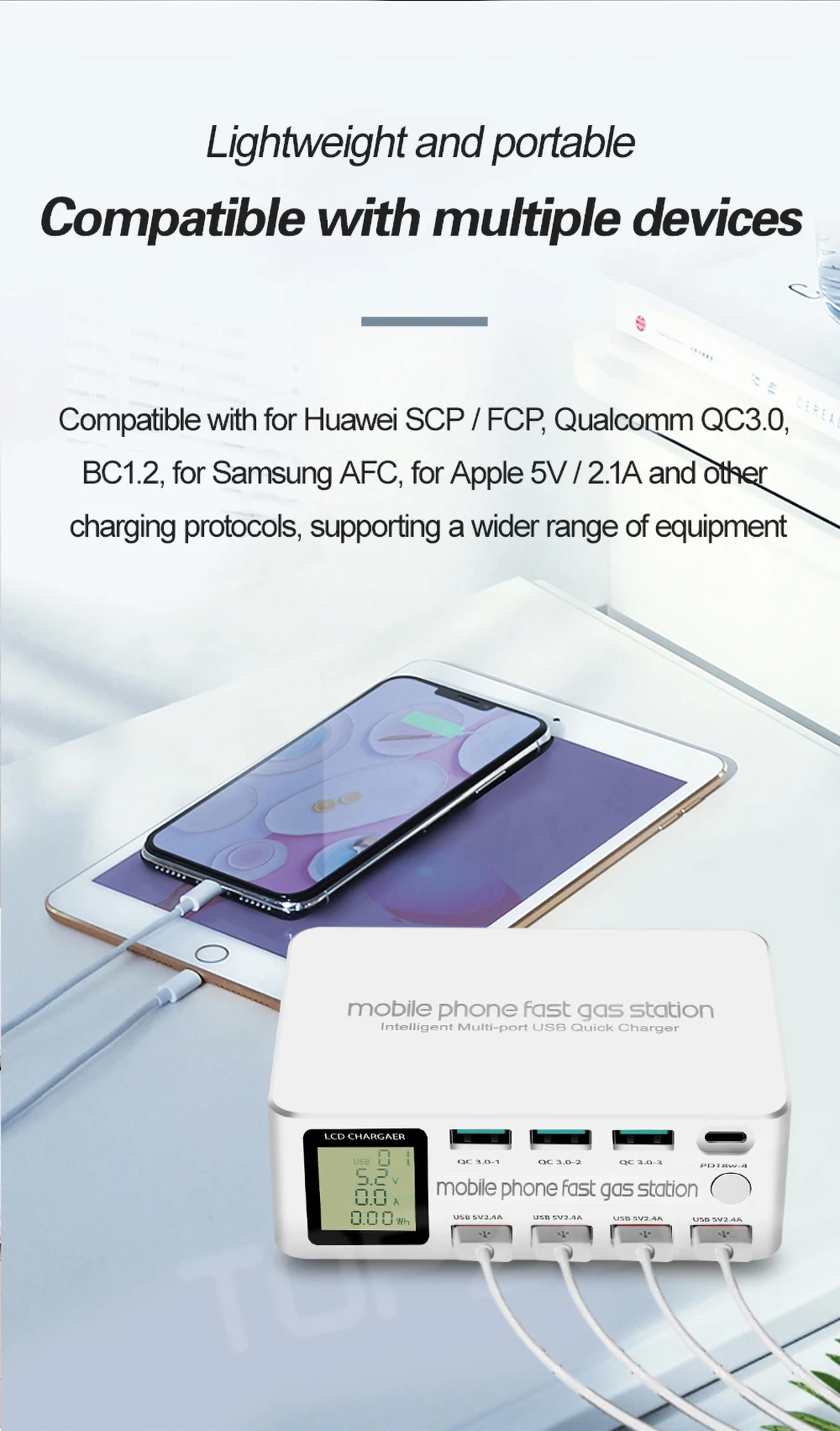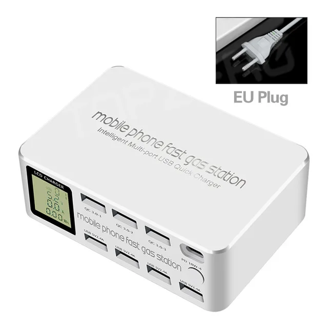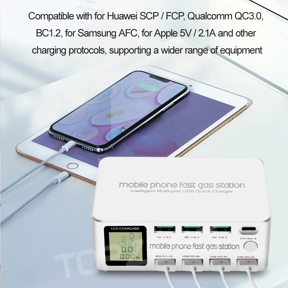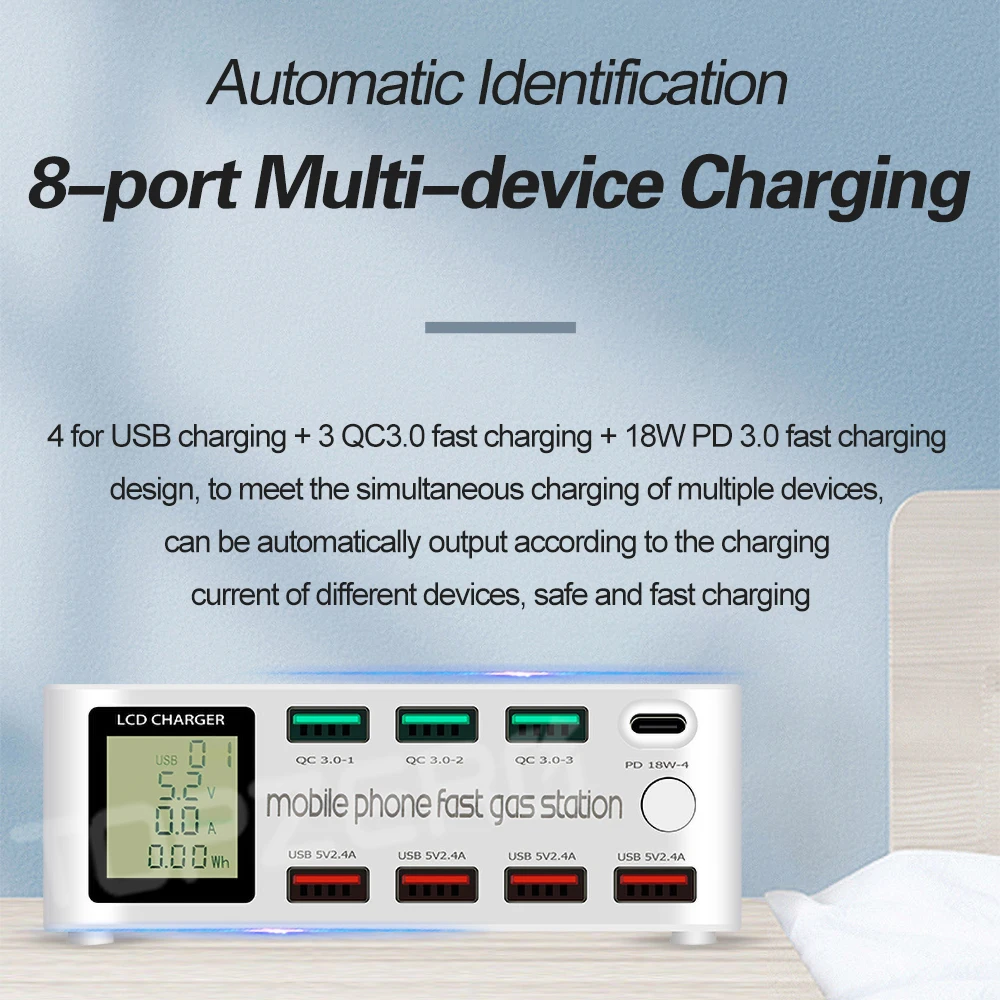 Умное зарядное устройство с 8 USB-портами, 100 Вт, быстрая зарядка 3,0 PD 3,0, адаптер для быстрой зарядки с ЖК-дисплеем, зарядная станция с несколькими USB-портами для iPhone X, XS, Samsung