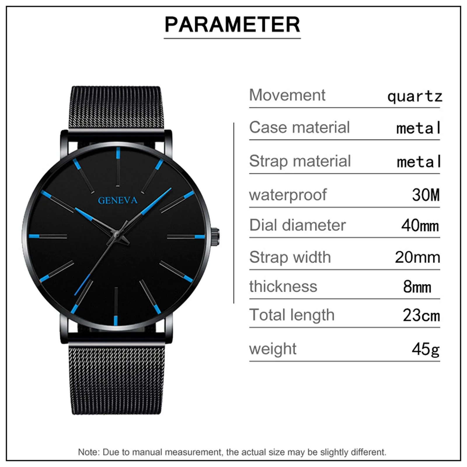 5. Диаметр корпуса: 4,0 см ширина ремешка: 2,0 см, длина ремешка: 24 см