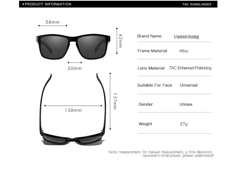 Детали производства Материал оправы: поликарбонат + сплав Объектив: TAC Стиль: квадратный Костюм: унисекс Размер: 1. Высота линз: 42 мм 2. Переносица: 20 мм 3. Ширина линз: 58 мм 4. Длина дужек: 137 мм 5. Ширина оправы: 138 мм