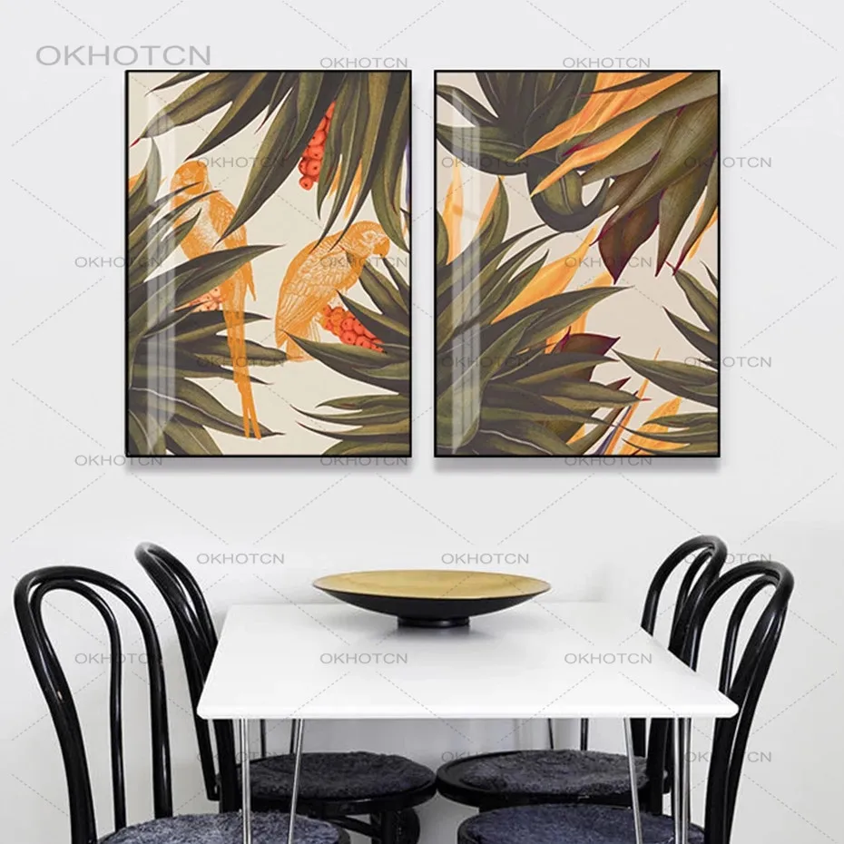 Плакат на холсте, с изображением тропических листьев, желтого попугая
