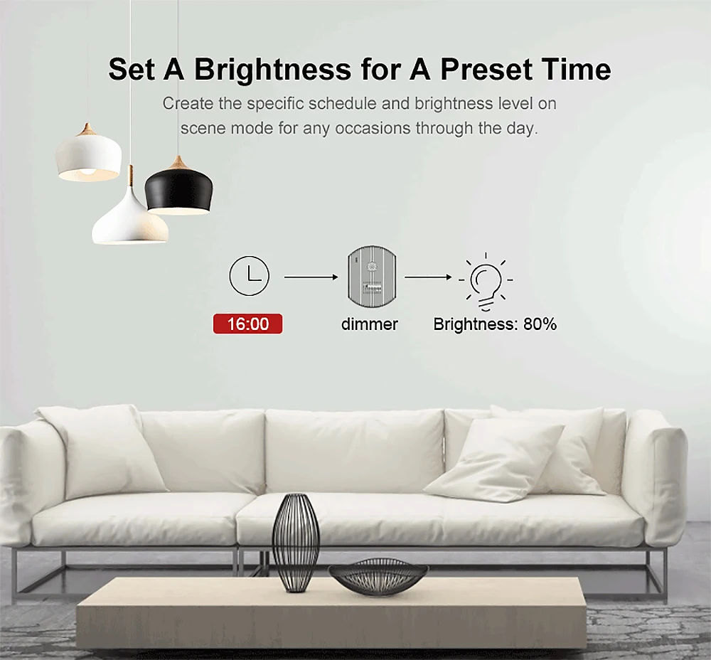 1: тусклый светильник для спокойного сна Развивайте ночные опасения перед сном? Просто остановите светильник в спальне на нужном уровне светильник в приложении eWeLink 2: даже более легкое затемнение под рукой Выключите светильник случайно с пультом дистанционного управления RM433 в захватывающую ночь фильма, наслаждайтесь моментом погружения 3:4 уровень яркости меняется по вашему настроению Настраивается на 4 уровня освещения на пульте дистанционного управления RM433, настраивается на самый высокий и самый низкий уровень яркости в приложении eWeLink. Получите все ваши потребности 4: включение и выключение, управление двумя способами Включите/выключите светильник, как вам нравится, будь то пульт дистанционного управления или смартфон 5: Установите яркость для заданного времени Создайте определенный уровень scedule и яркости в режиме смарт-сцены для любых случаев в течение дня 6: Режим восхода и захода солнца Следите за восходом солнца и устанавливайте время своего местоположения, чтобы вы могли создать сцену, которая активируется в фиксированное время, когда солнце поднимается или когда солнце садится 7: Настройте вечерние настроения Поверните вверх/вниз светильник уровня яркости с вашей голосовой командой для отличной атмосферы 8: применимые светильники Поддерживает тусклый светильник накаливания и светодиодный светильник с регулируемой яркостью 9: подходит для идеального сочетания Дополнительный пульт дистанционного управления, может быть непосредственно установлен на 86 Тип монтажной коробки