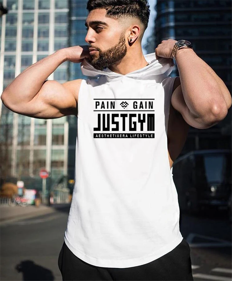 Майка мужская хлопковая с капюшоном, Спортивная майка для бодибилди...