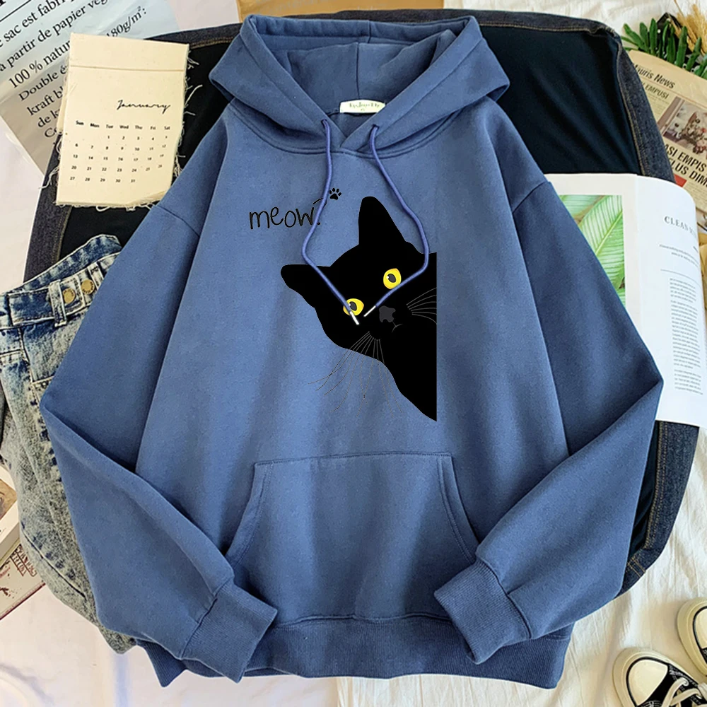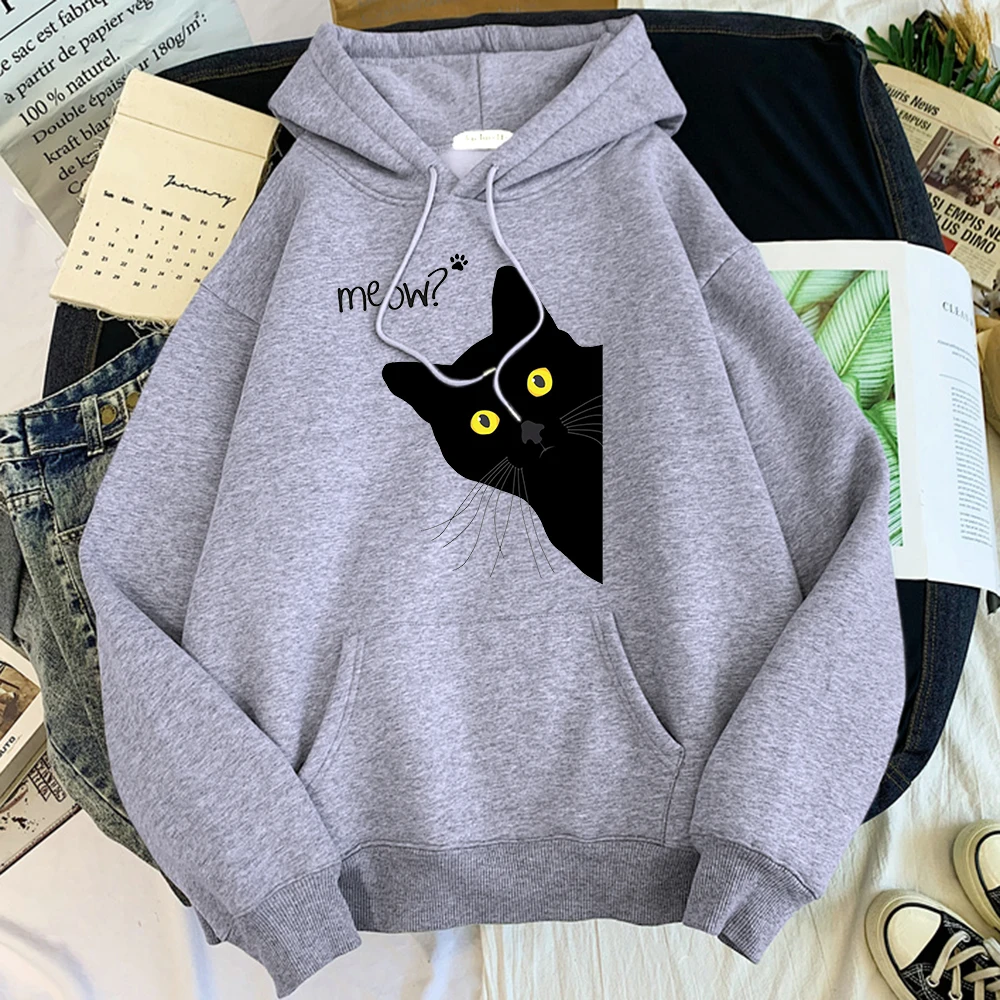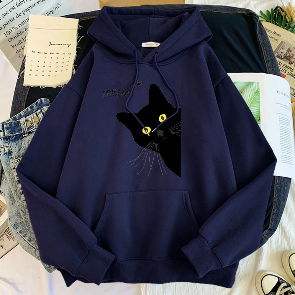 Толстовка с капюшоном с изображением большого черного кота, женская уличная одежда, теплые толстовки для девочек, модная зимняя женская толстовка и худи