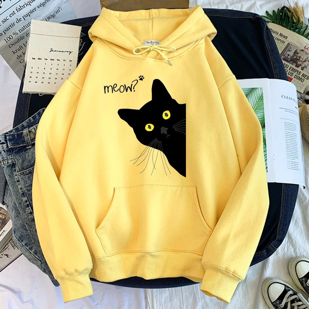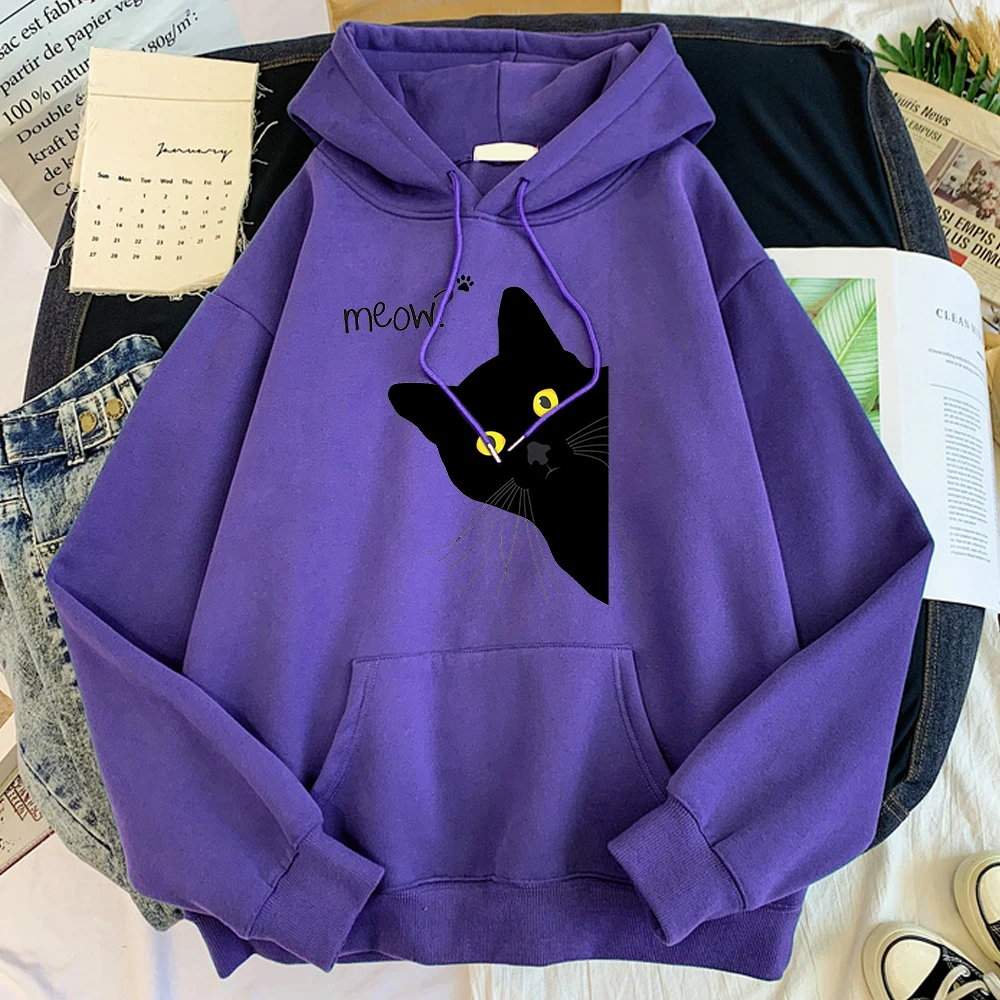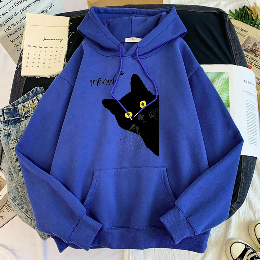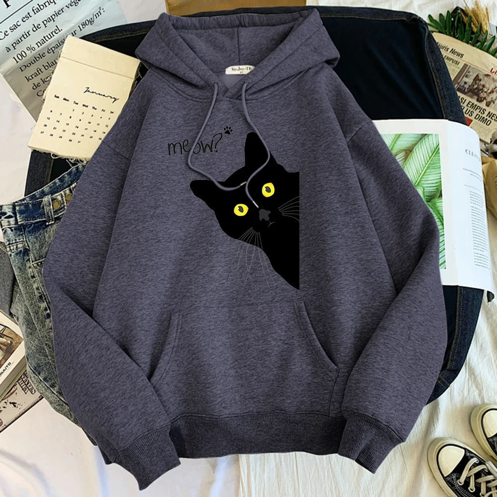 Толстовка с капюшоном с изображением большого черного кота, женская уличная одежда, теплые толстовки для девочек, модная зимняя женская толстовка и худи