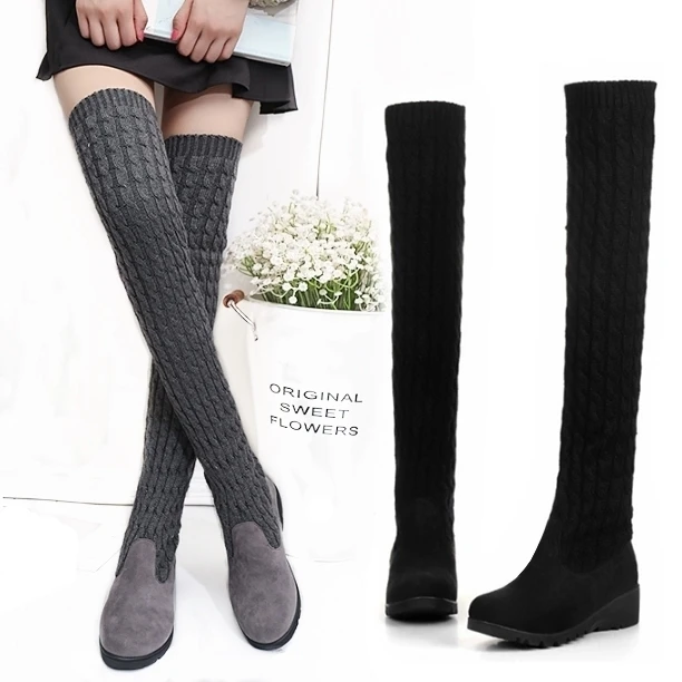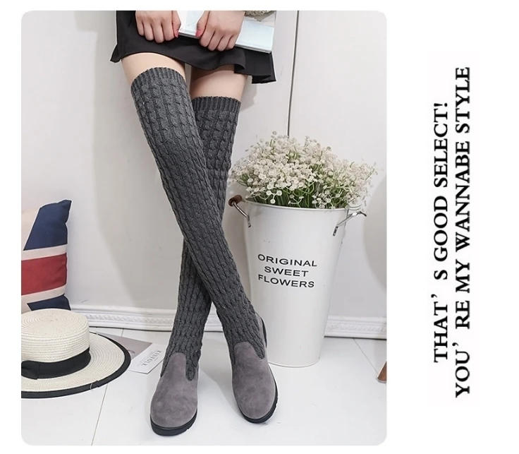 Тянущихся тканей ботфорты выше колена новые вязанная шерстяная обув...