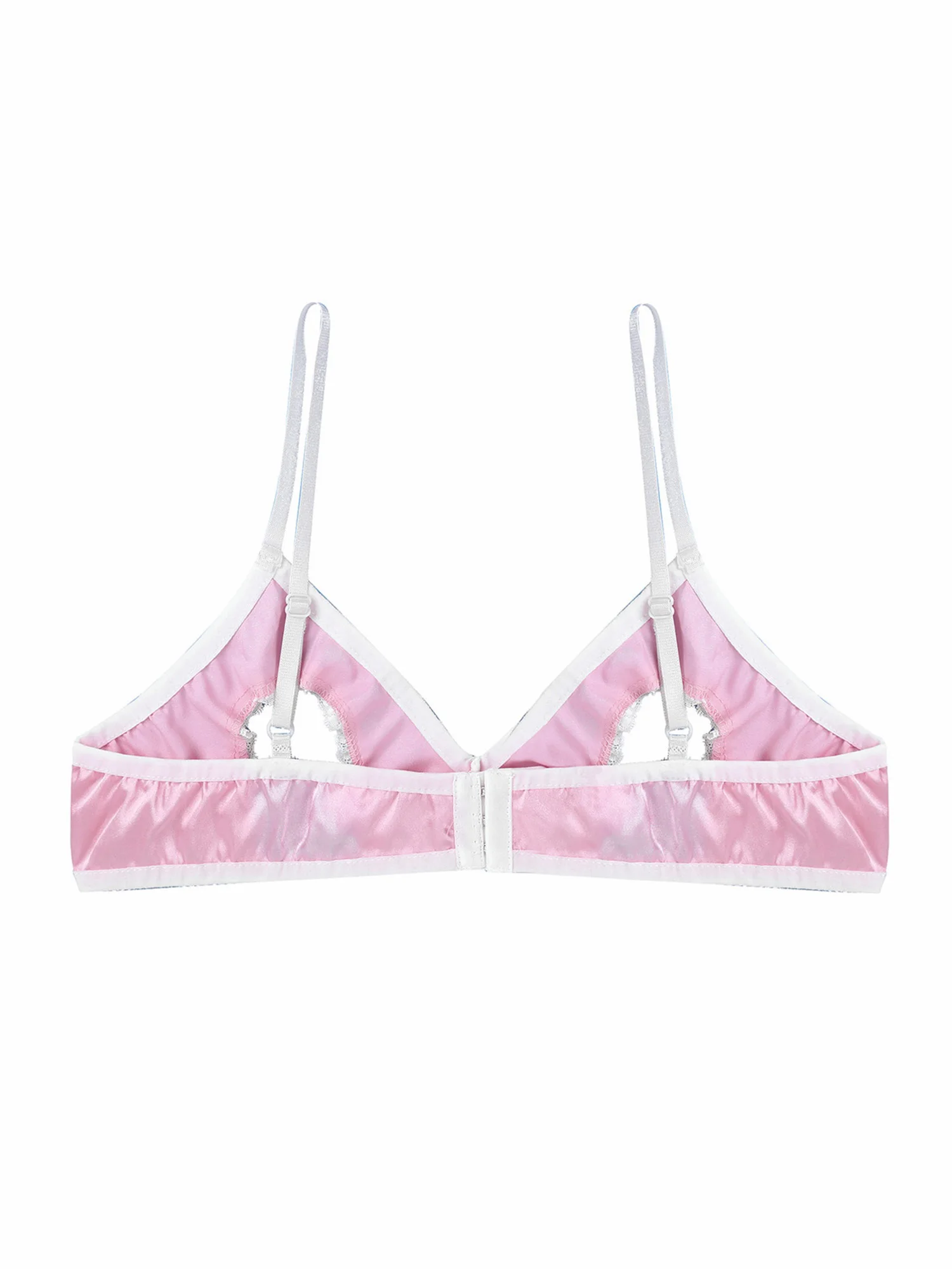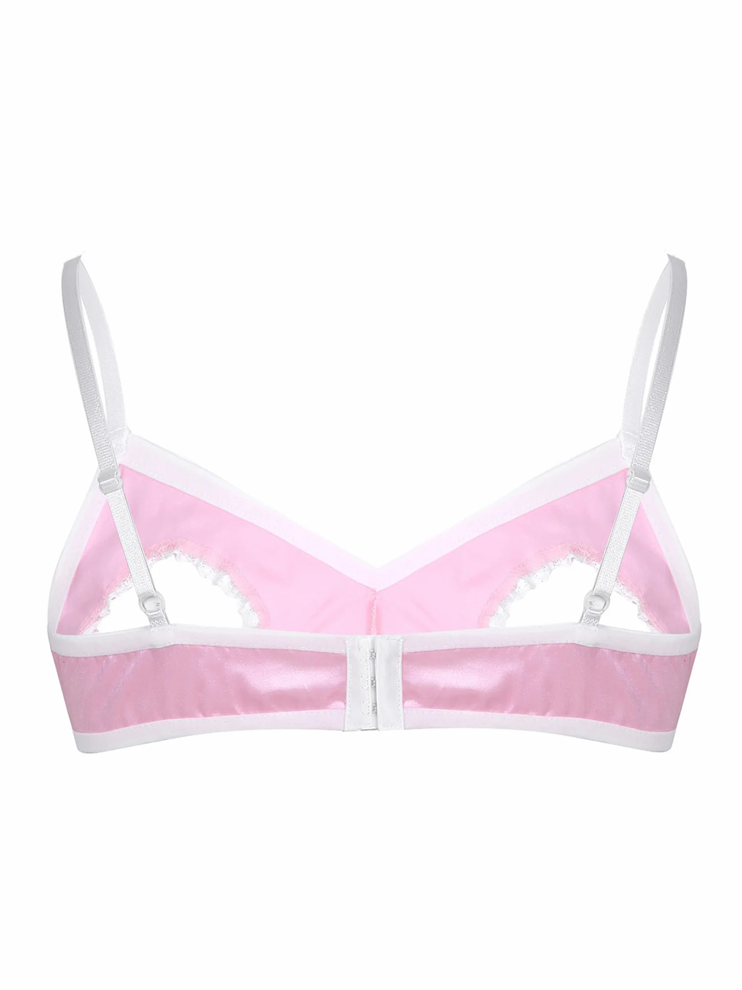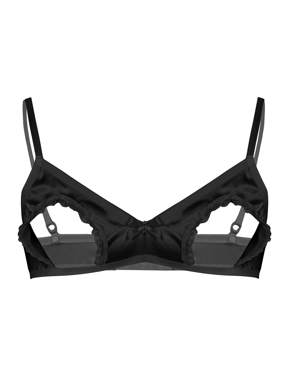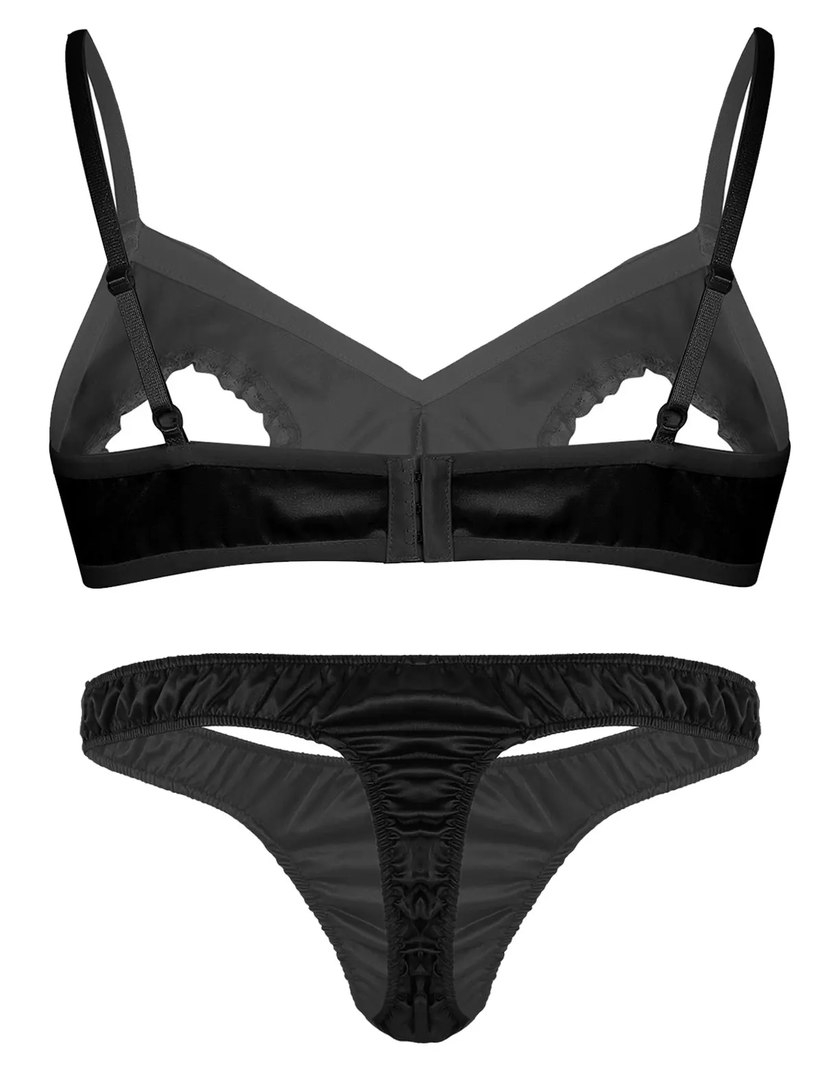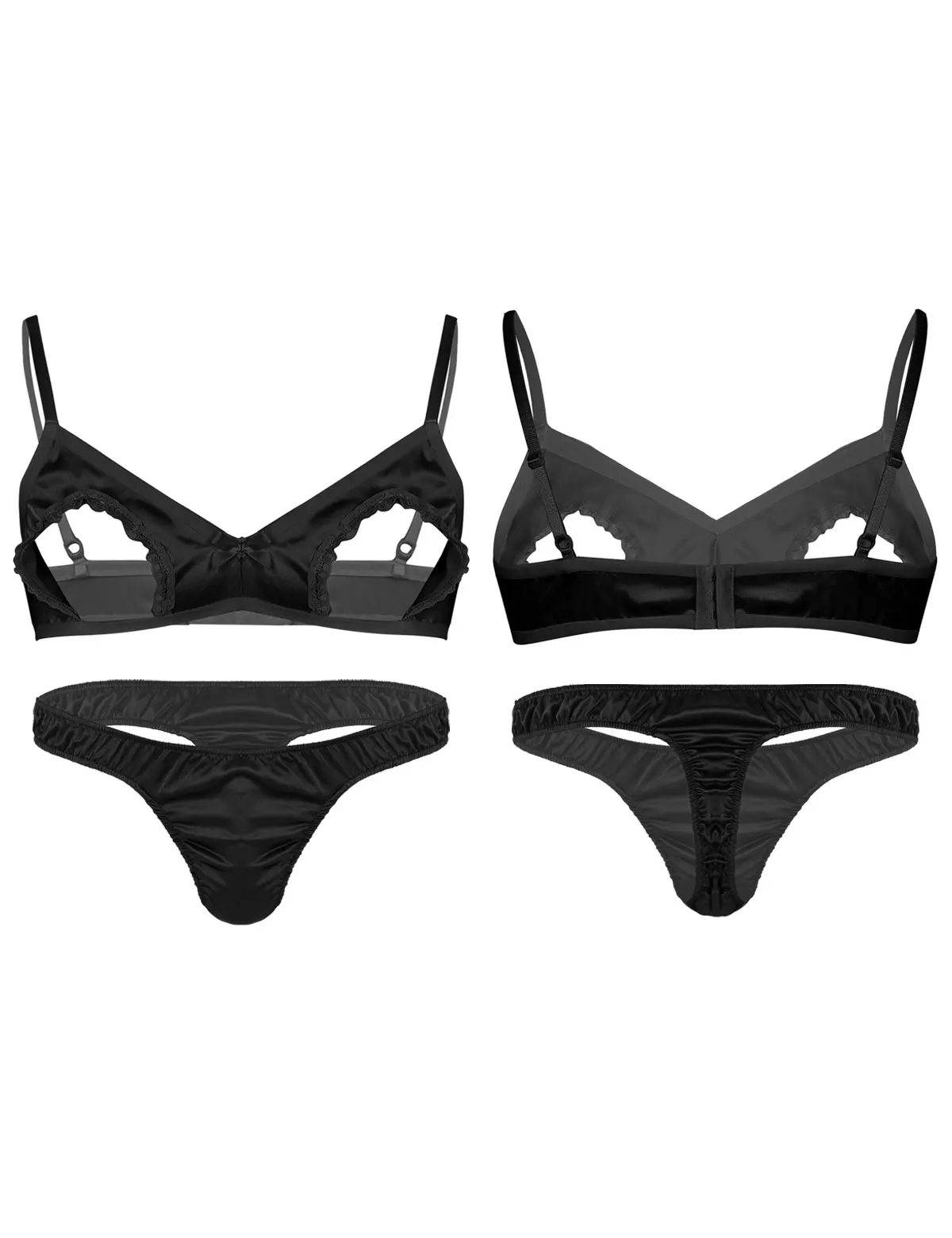Мужской комплект нижнего белья, гей, косплей, сексуальное атласное женское белье, набор, открытые соски, без косточек, бюстгальтер, топ с низкой посадкой, бикини, стринги