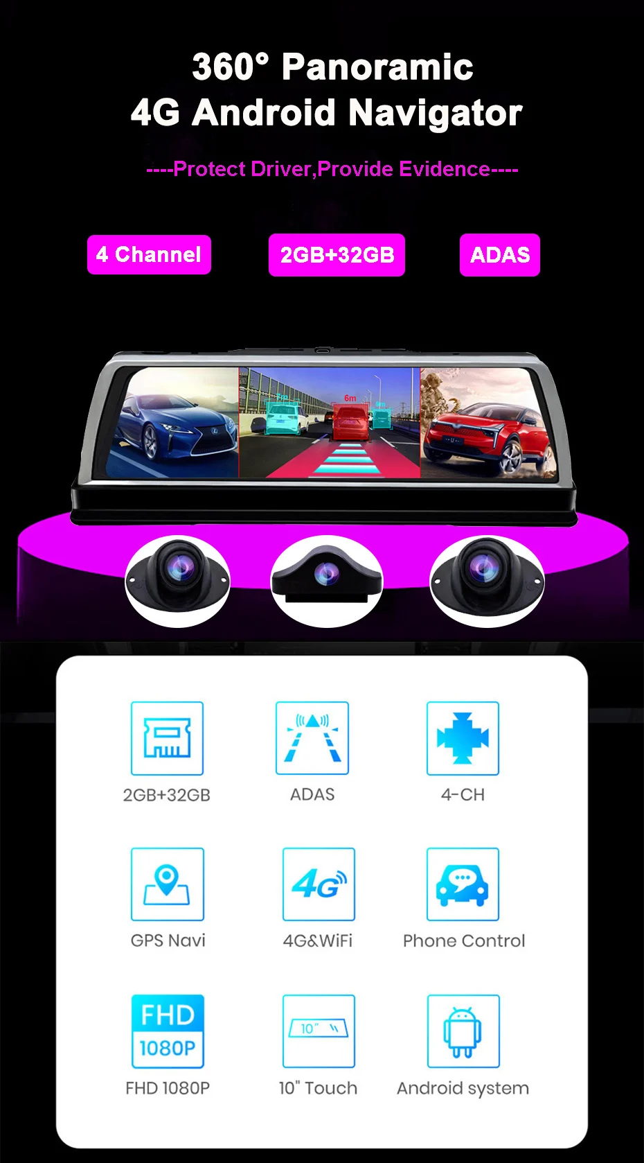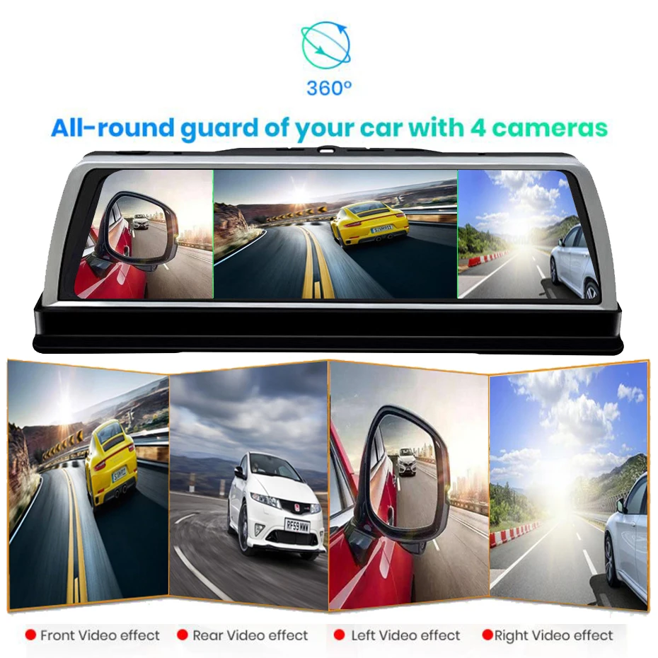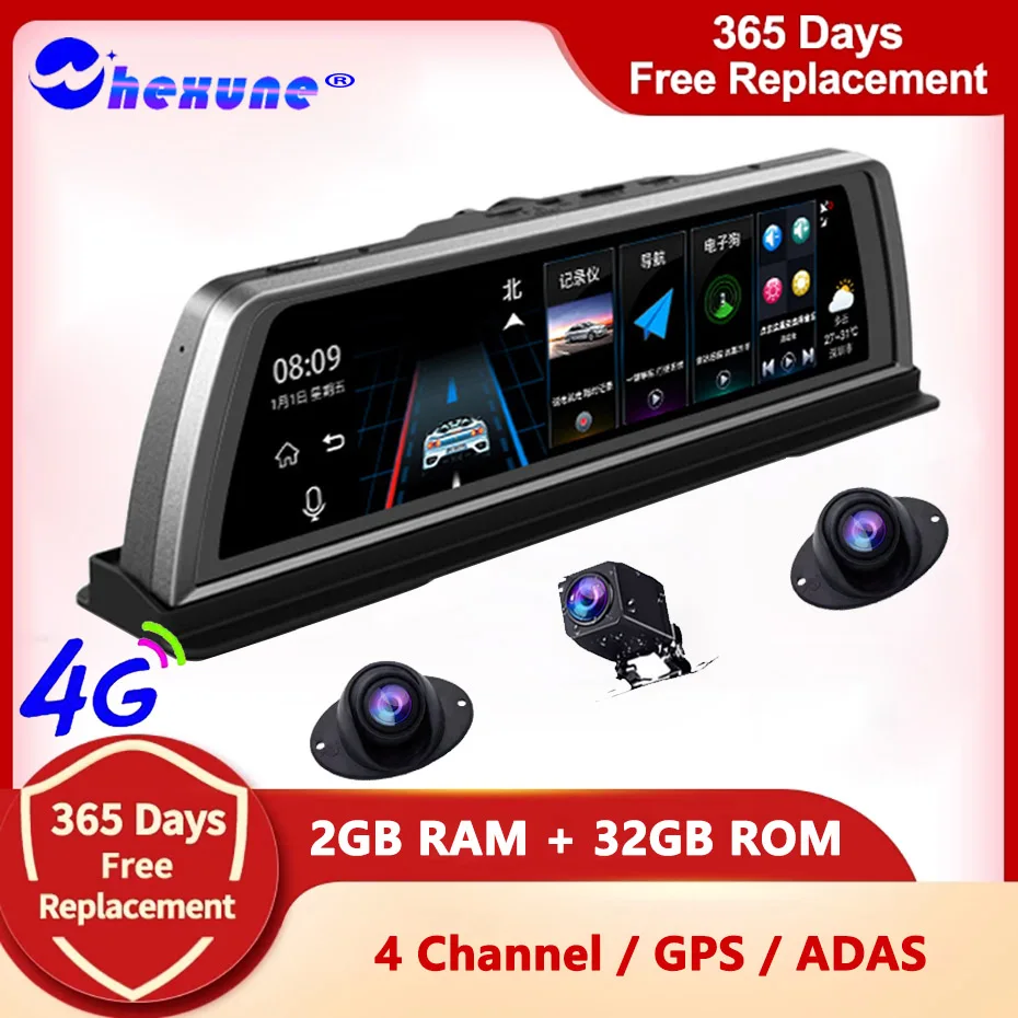 Видеорегистратор WHEXUNE 360 , 4 канала, 10 дюймов, 4G приборная панель, Android, DVR, ADAS, WIFI, GPS-навигация, FHD 1080P