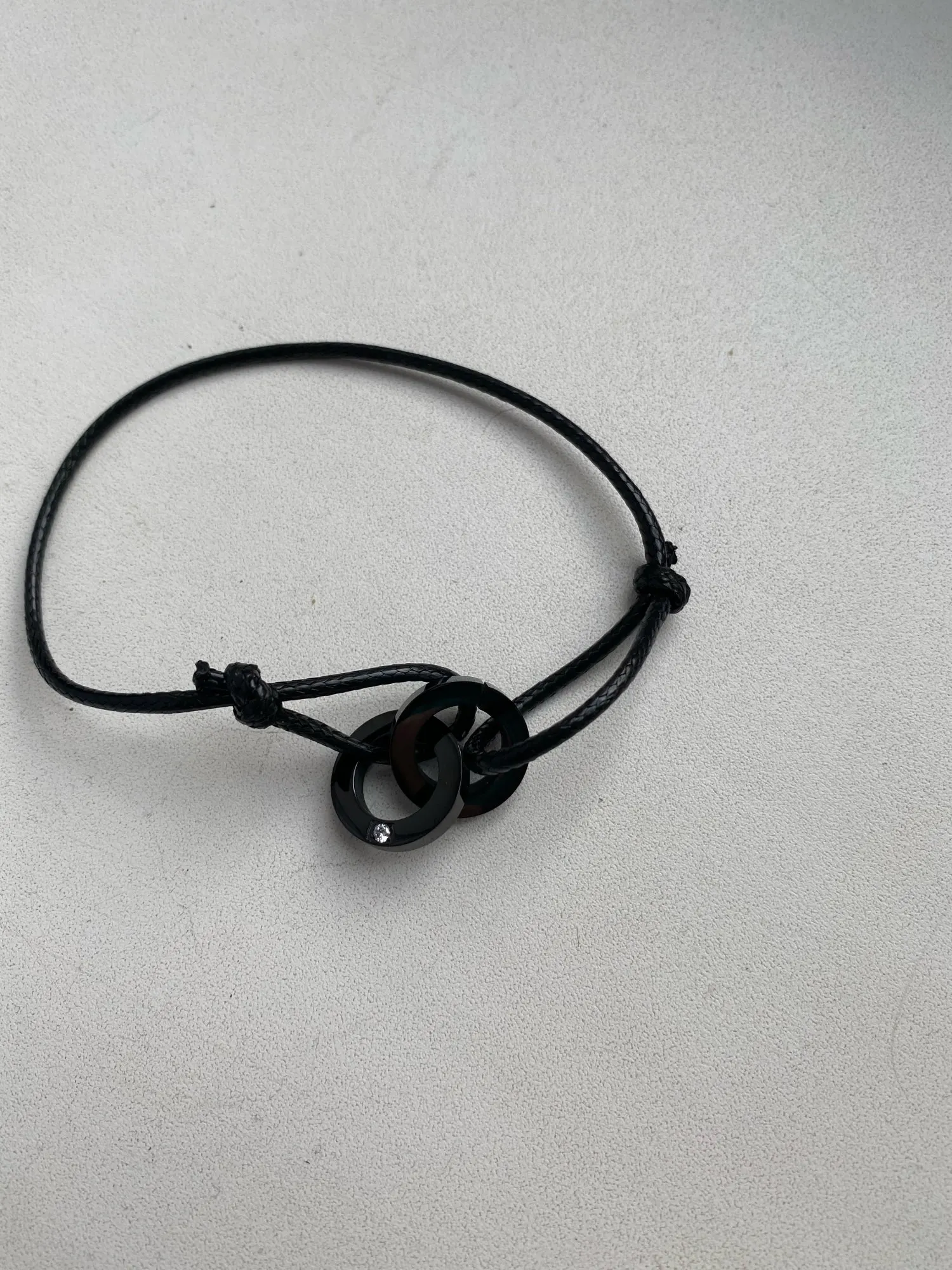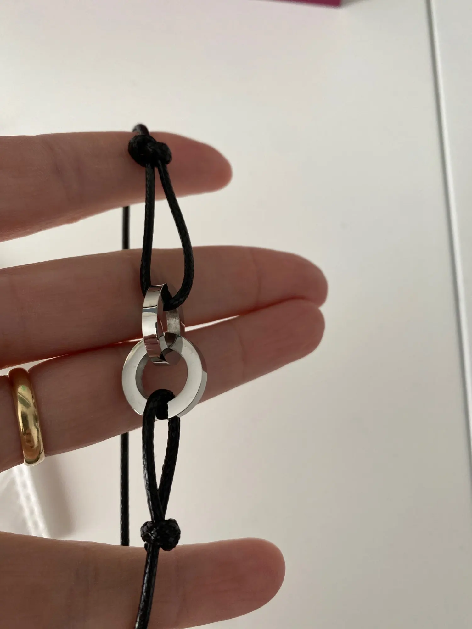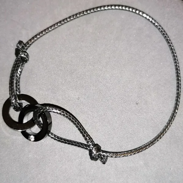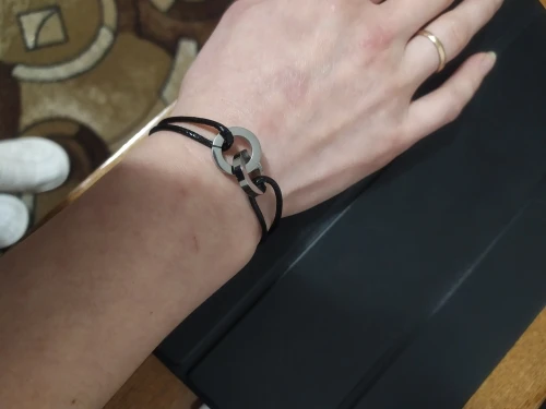 Брала в распродажу. Приехало за 18 дней в сборной посылке Новой почтой. Браслет интересный. Колечки сцеплены между собой. На одном прорезь, на втором камушек. На сталь похожи. А вот узелки на шнуре не держат, если их передвигать, так чтоб надеть на руку, как и задумано. Если затянуть сильнее, то не расширяется и не натягивается. Буду думать. В наборе фирменный мешочек для хранения.