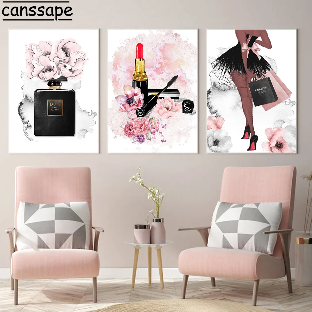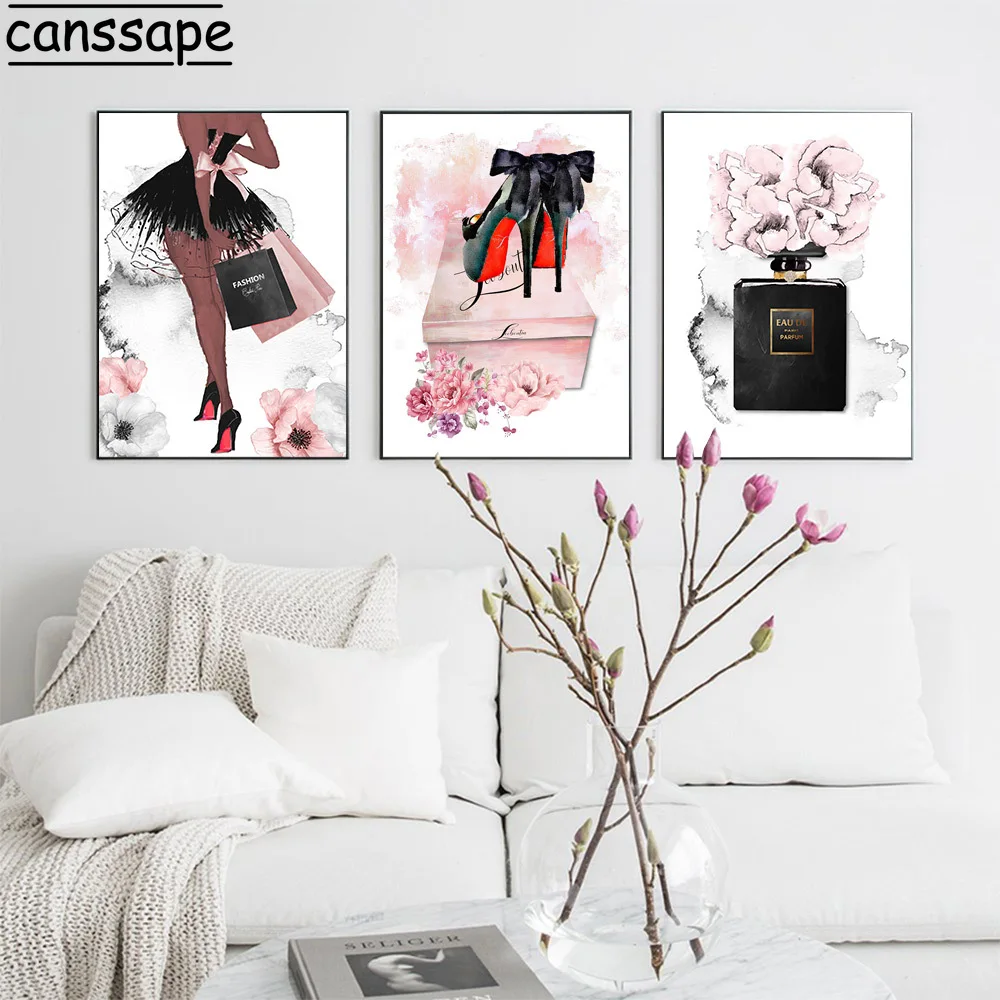 Современный женский настенный художественный принт, постер с духами, картина на высоких каблуках, макияж, холст, принт с розовыми цветами, настенные картины, украшение для спальни