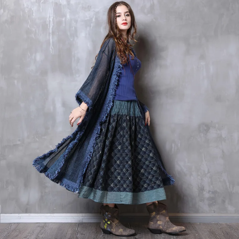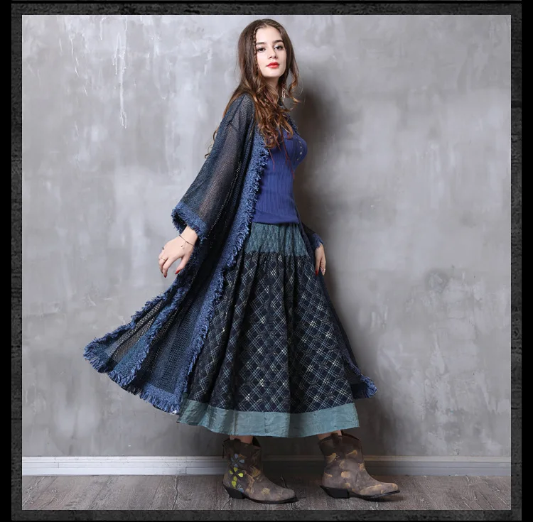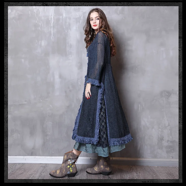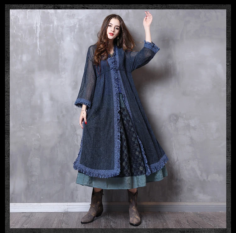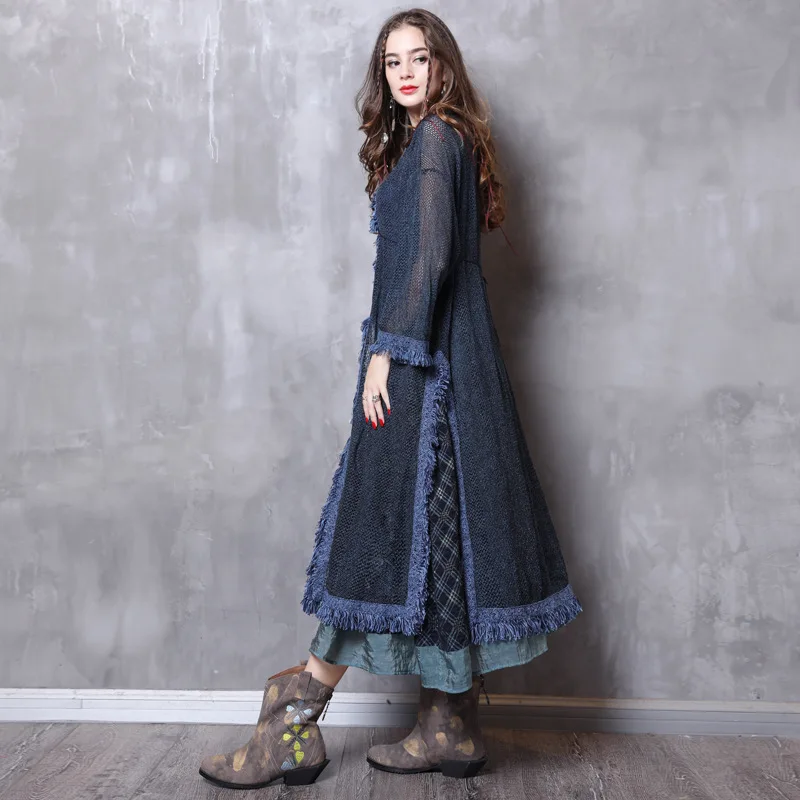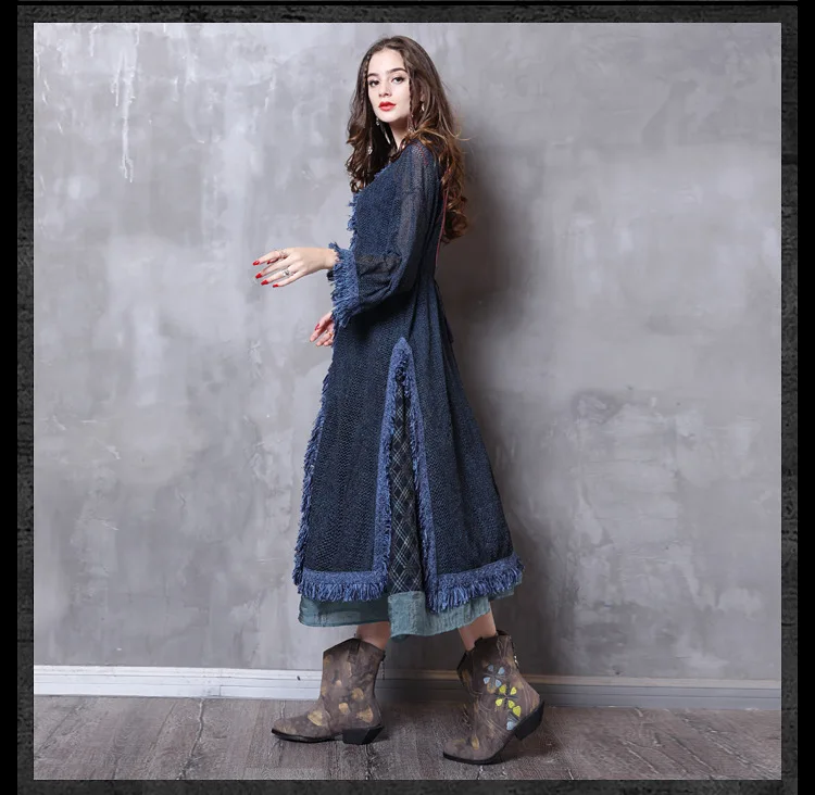 Женский длинный кардиган из смесового хлопка Johnature, синий винтажный свитер с длинными рукавами и кисточками, Повседневный, осень 2021