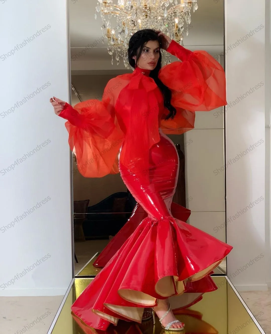 Современные красные вечерние платья-русалки с разрезом по бокам и о...
