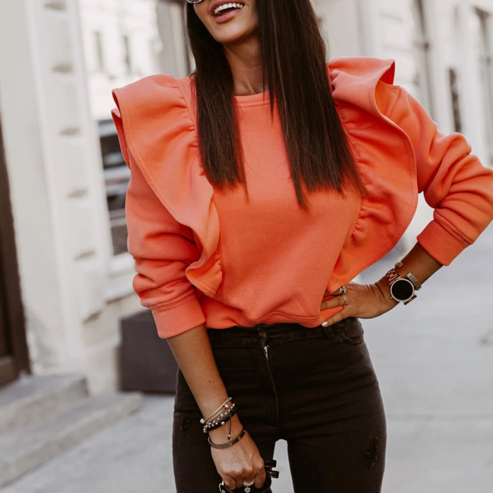 Женская блузка с круглым вырезом, длинным рукавом и рюшами