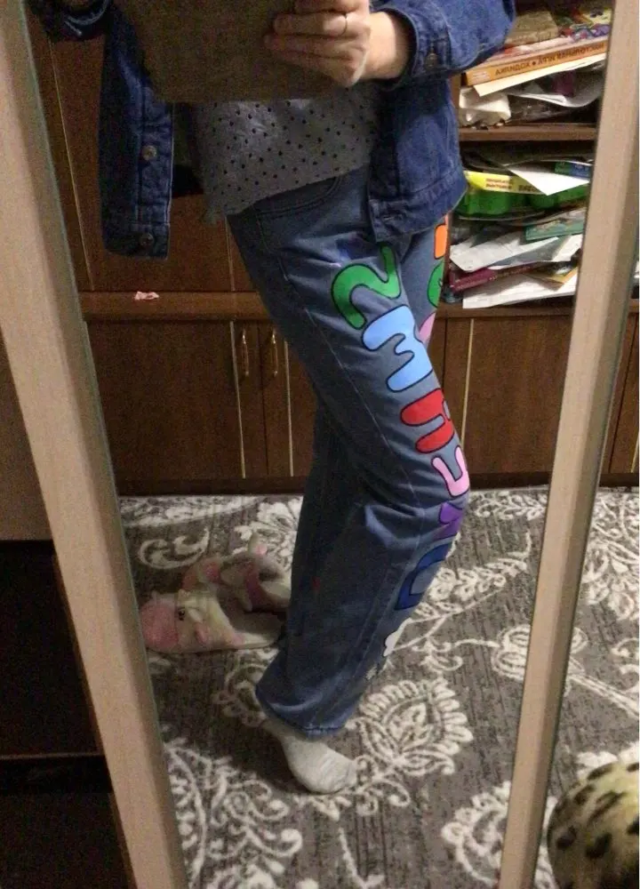 Очень хорошие джинсы! Полностью соответствуют фото продавца. Размер действительно надо покупать больше, чем носите. Ткань джинсов плотная, качественная, сшиты аккуратно. Очень довольны!