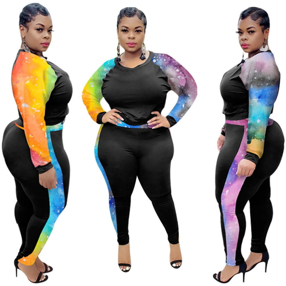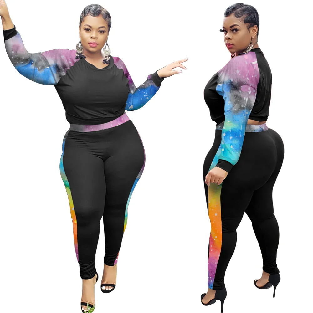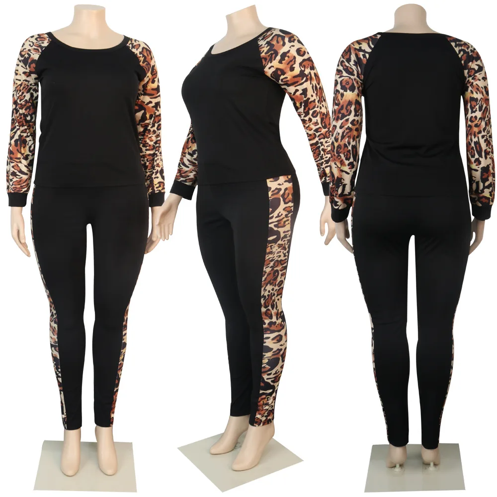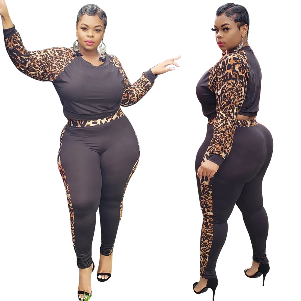 Женский спортивный костюм FNOCE, с леопардовым принтом, круглым вырезом и длинным рукавом, узкие брюки, большие размеры, осень 2020
