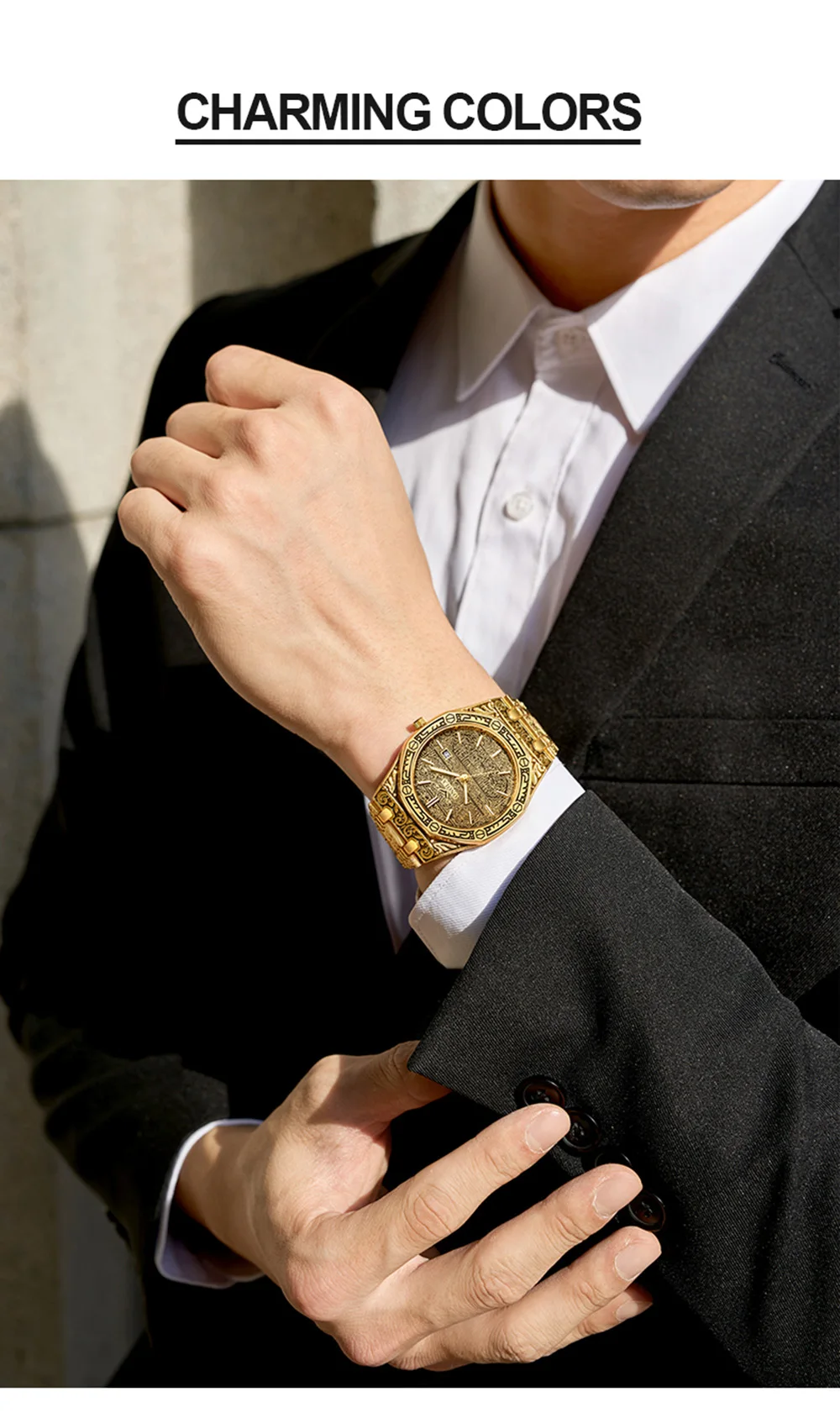 Деловые кварцевые мужские часы, классические роскошные винтажные золотые часы для мужчин, ретро резные мужские наручные часы, Relogio masculino day date