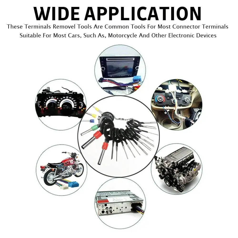 * Инструмент для удаления контактных терминалов подходит для большинства разъемов и используется для большинства автомобилей, мотоциклов и другого электронного оборудования (например, бытовой техники).