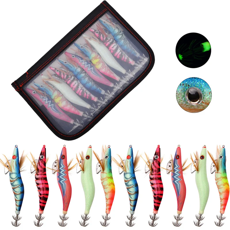 10 шт.пакет приманок 12 г, 15 г, 21 г деревянная креветка рыболовная приманка искусственная приманка 3D глаза световой Каракатица Осьминог крюк