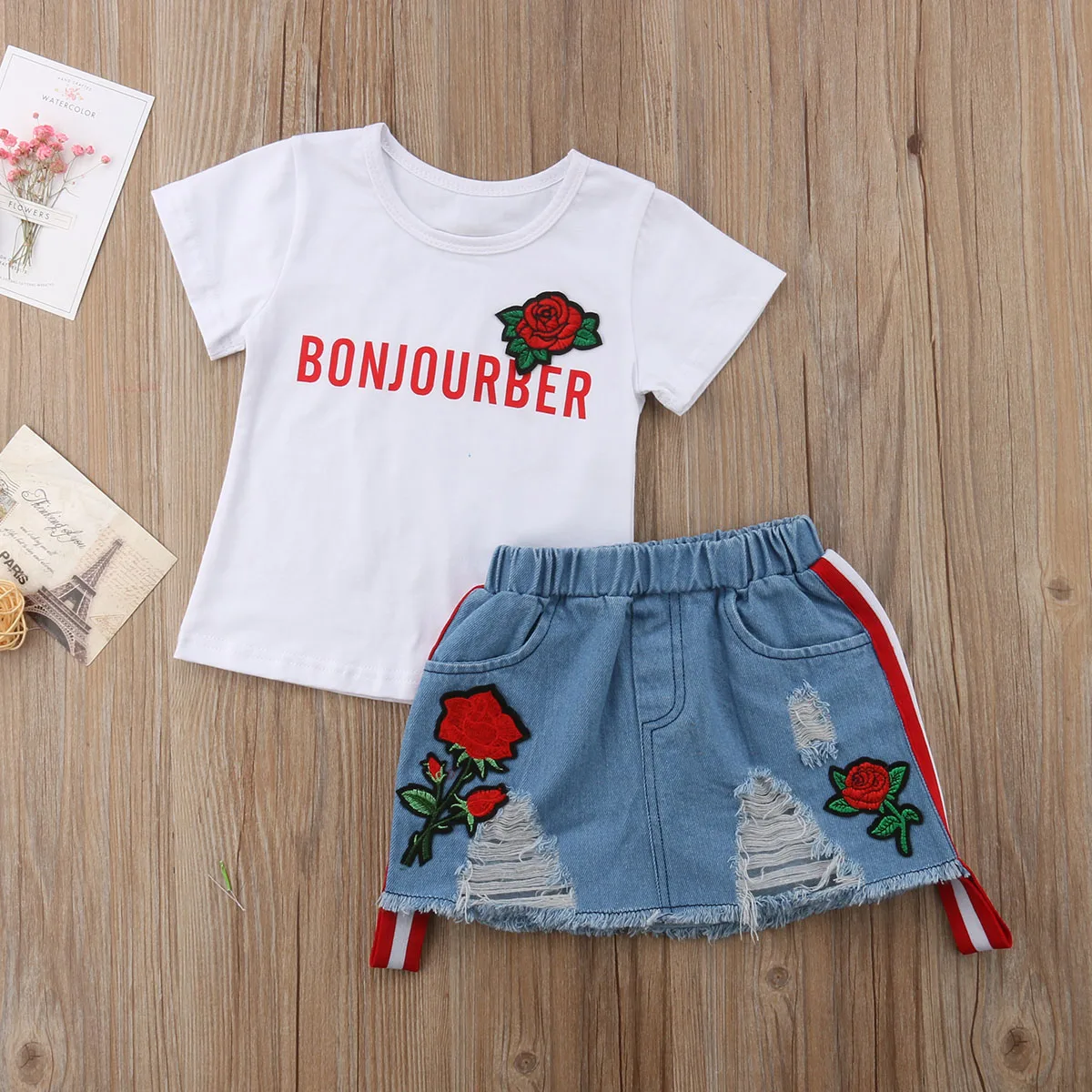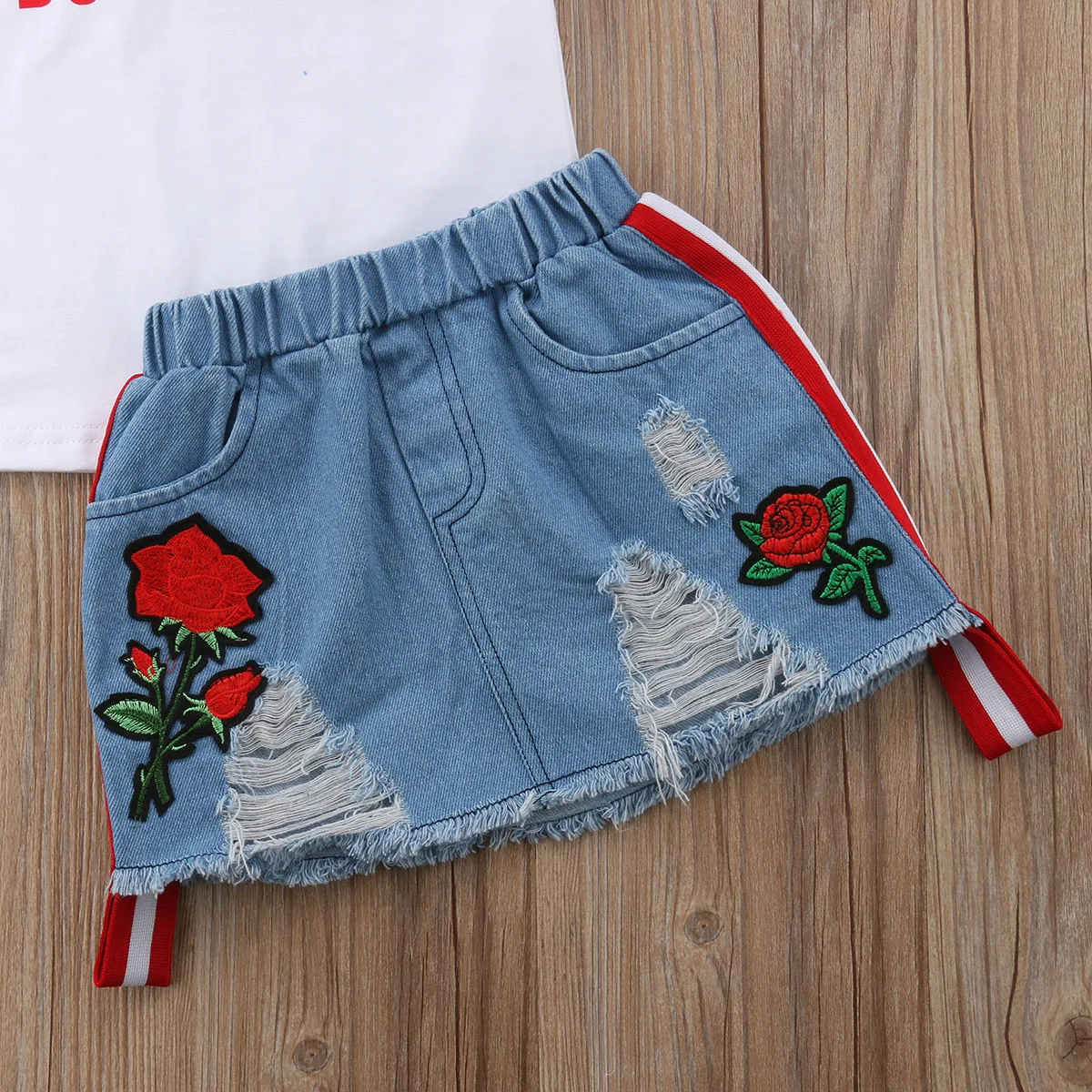 2 шт.комплект, футболка с коротким рукавом и джинсовая юбка с вышивкой