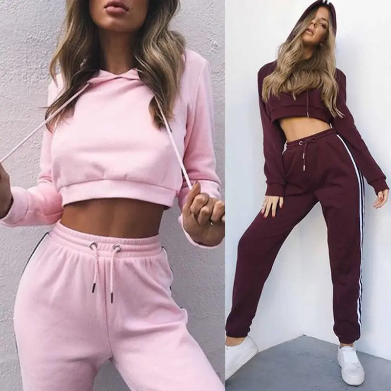 Комплект из двух предметов, спортивный костюм для женщин, Осенний укороченный топ с капюшоном, толстовка с кулиской, штаны в полоску, костюмы, женская одежда