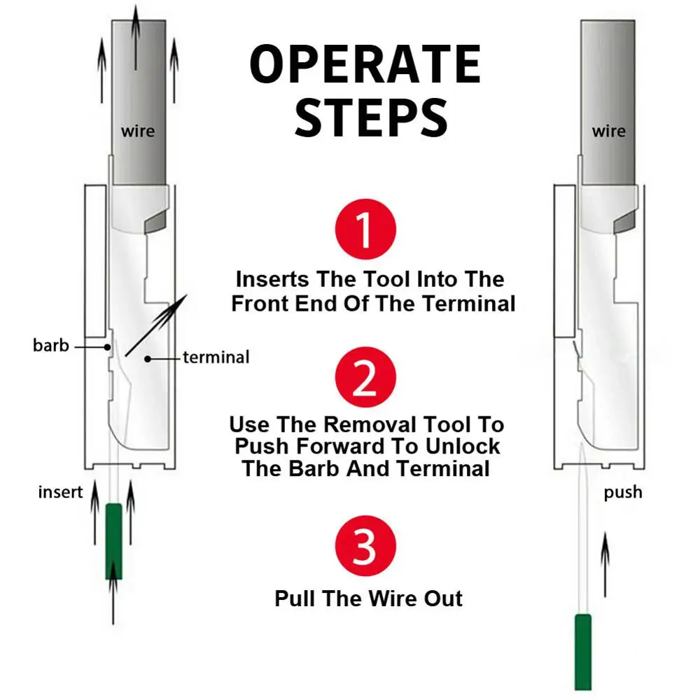 * Терминальный инструмент не нужно приклеивать клеммы! Просто вставьте наш инструмент, нажмите и потяните клеммные булавки для удаления. Наш инструмент обеспечивает дополнительное плечо, так что вы можете легко удалить провод.
