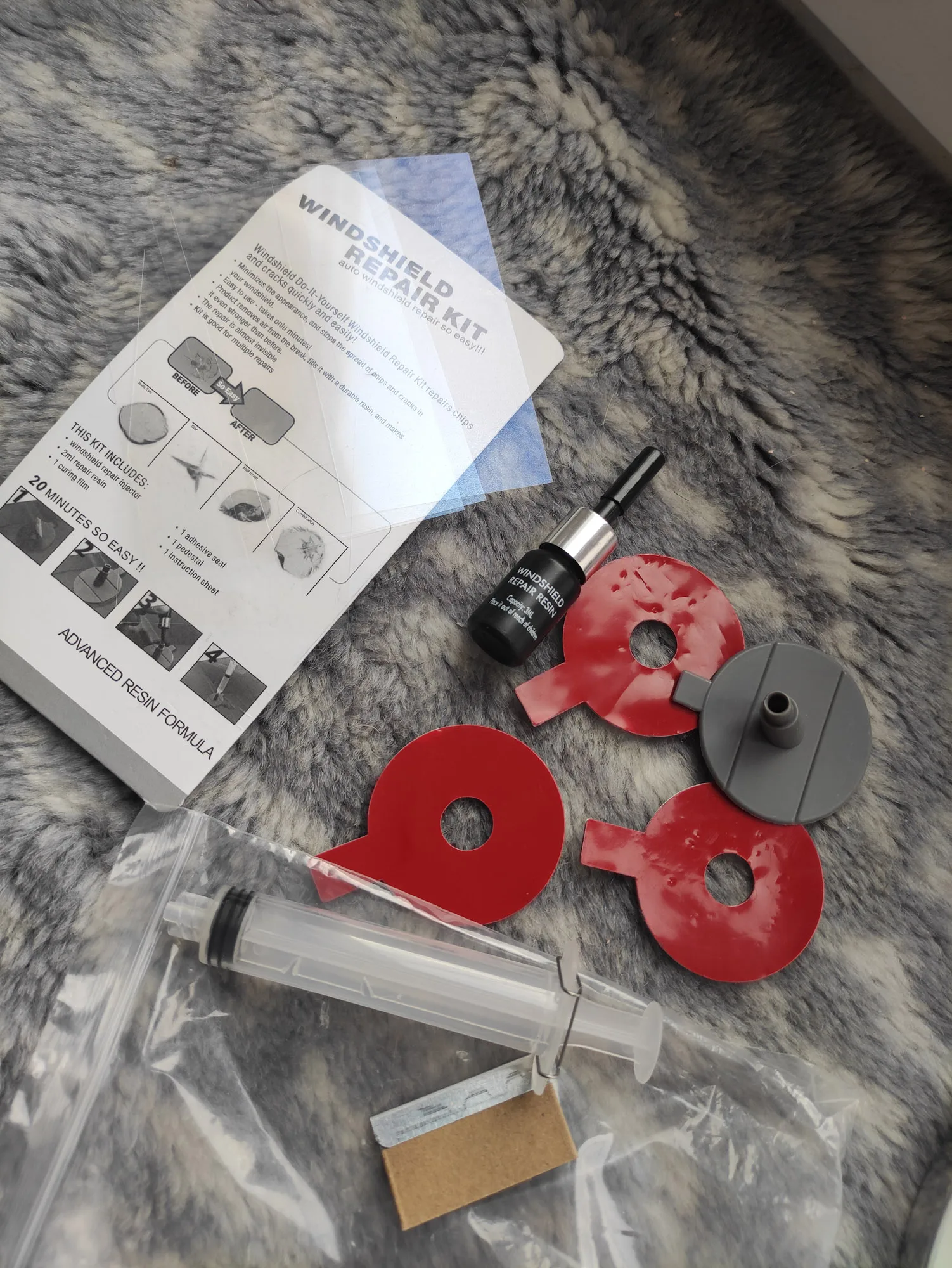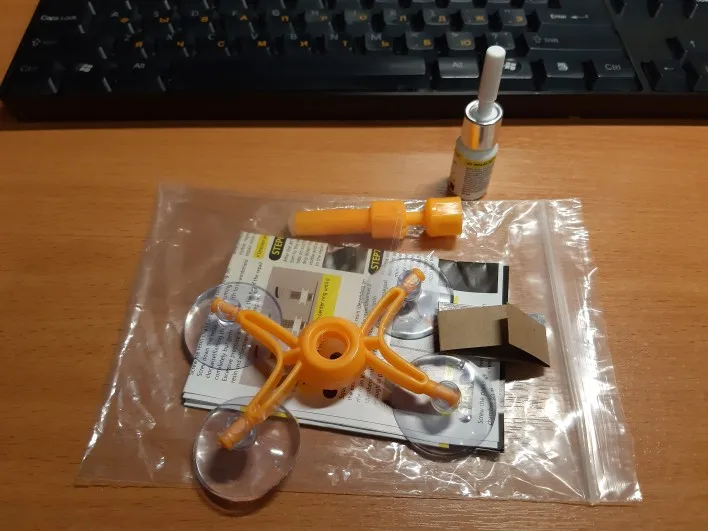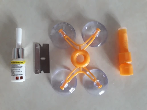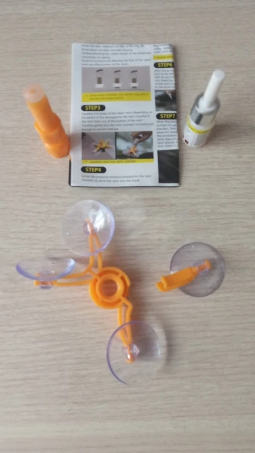 Товар пришёл обычной скоростью. Пока не использовал, зима. В комплекте идёт все как в рекламе. Но нужно к этому набору ещё добавить сверло для ветрового стекла и так далее,плюс умелые руки. Учитывая ремонт скола на стекле около 500 рублей, решайте сами. Да и товар по качеству нареканий не вызывает, можно брать.