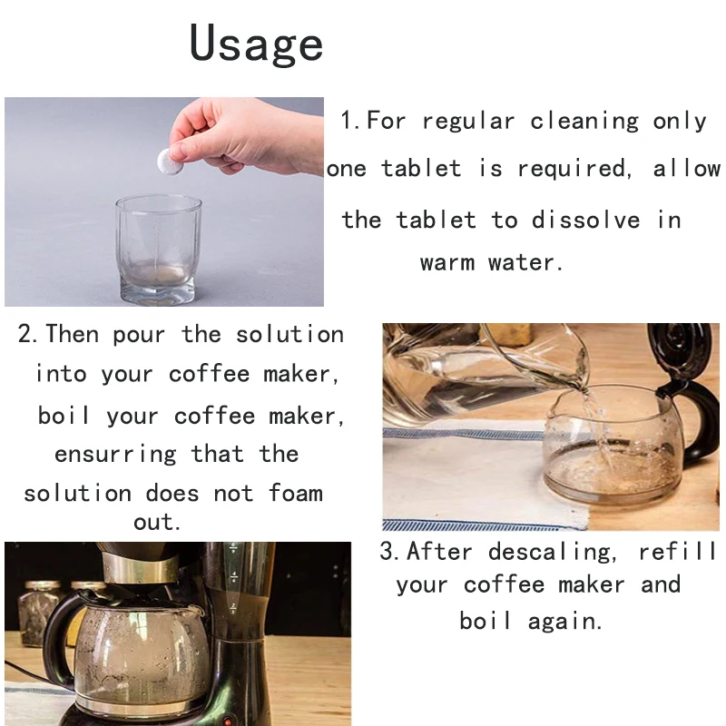 1. Для обычного де-масштабирования только onetablet является reguired, а затем позволить таблетке раствориться в приближении 1/2 литров воды.2. Налив раствор в кофемашину, Вскипятите кофеварка, чтобы раствор не вспенился.3. После удаления накипи Пополняйте свою кофеварку и снова варите. Повторите это.