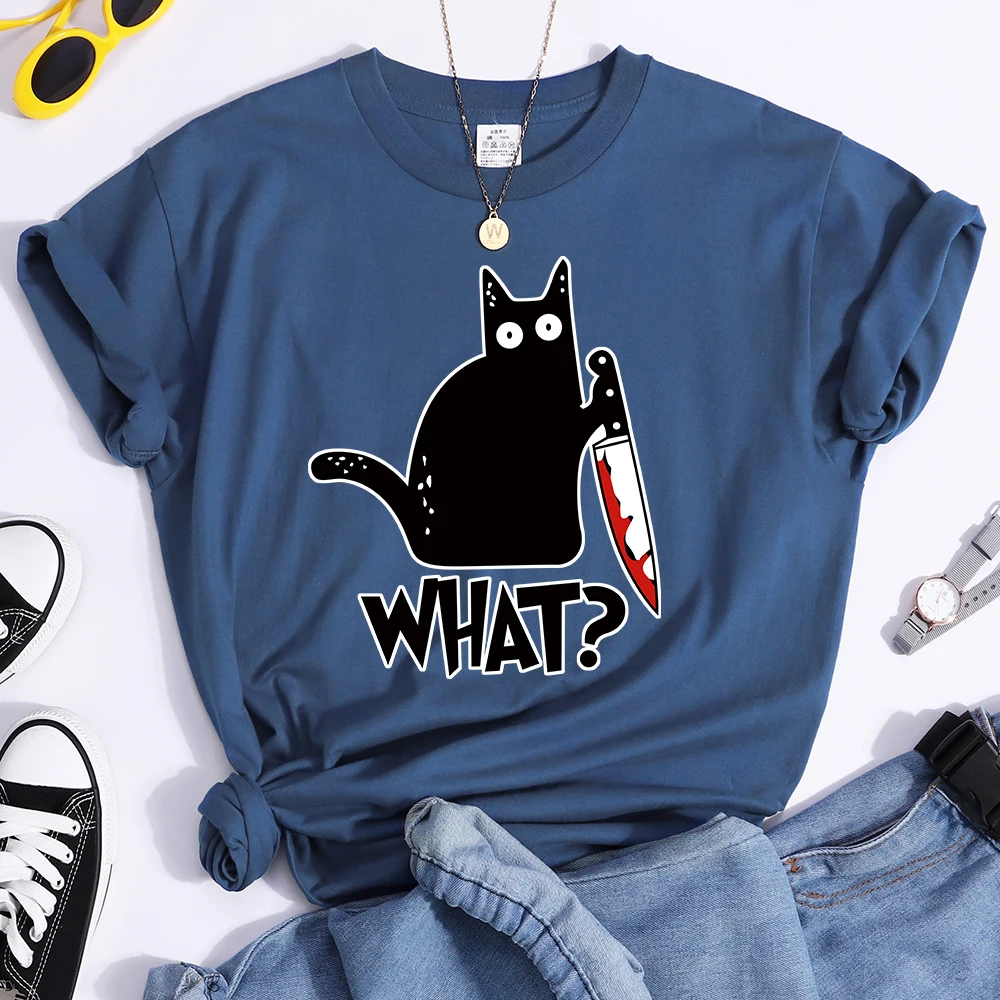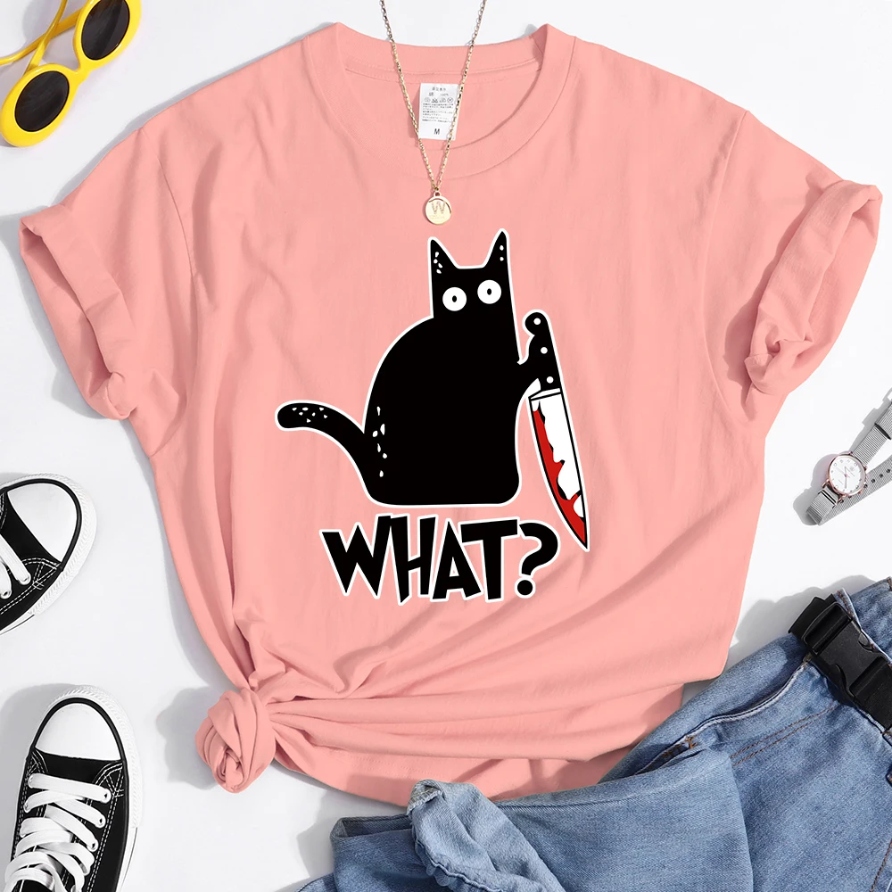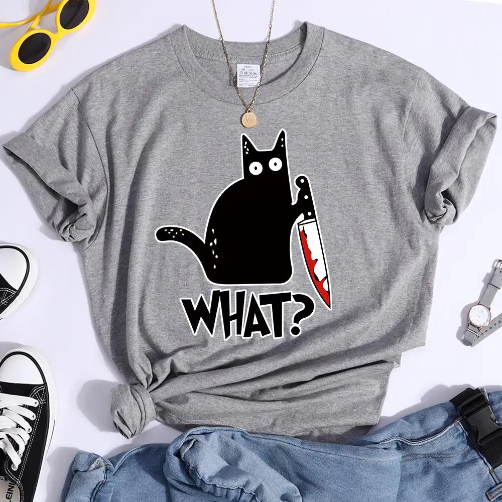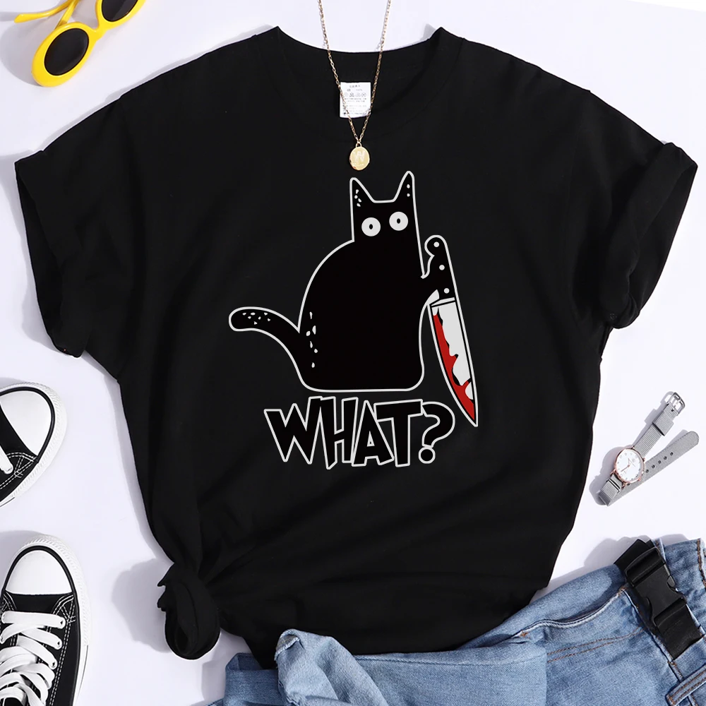 Женская футболка с маленьким черным котом и ножом, женские футболки, футболки в стиле хип-хоп Harajuku, женские модные футболки с коротким рукавом