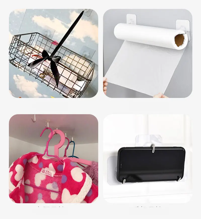 С двумя крючками, сочетающимися друг с другом для легко и удобно подвешивания, это до 15 кг на один крючок, установленный на стене и потолке. Без сверления, без винтов, без отверстий, без клея. Супер водонепроницаемый и маслостойкий.