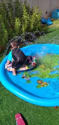 задумка крутая. не надо нагревать наливать бассейн . включил и фонтанчики бьют внизу воды охладиться детям достаточно, но конечно не плавать. но лопнул через час игры детей по шву см 30 (((