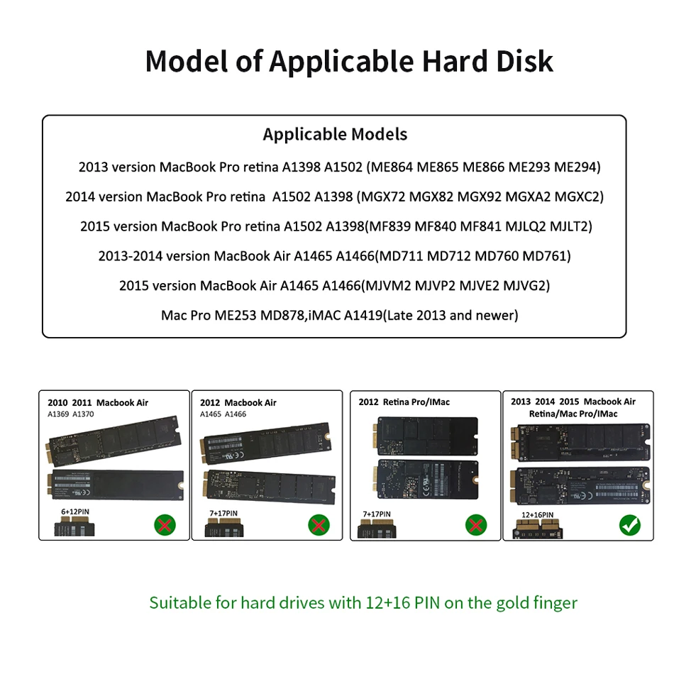 About Description: Description:This SSD enclosure adopts USB3.0 interface, supports plug and play and hot plug. The shell is made of aluminum alloy, the surface is oxidized and feels comfortable. It has good compatibility, good stability and fast transmission rate. Suitable for MacBook Air/Pro Retina 2013, 2014, 2015, 2016 and other versions of built-in SSD. Feature:USB 3.0 port brings fast transmission speed, the theoretical transmission rate up to 5Gbps to meet daily use needs.Adopt USB 3.0 port and DC power port to provide stable power supply, no driver required, plug and play and support hot plug.The SSD enclosure shell is made of aluminum alloy, surface oxidation sandblasting process provides comfortable feel, stable and drop-resistant, has good heat dissipation.Small size, easy installation, fast and convenient to use.Compatible with a variety of operating systems, support for Windows 7/8/10 and for MacOS 10, 10.5 above operating systems. Specification:Colour: BlackShell material: aluminum alloyInterface: USB 3.0Transmission speed: 5GbpsApplication: for MacBook Air / Pro Retina 2013/2014/2015/2016Product size: 110 * 37 * 13mm/4.33*1.46*0.51"Weight: 134g Attention:1. Please make sure your SSD is from the following models: for MacBook Air / Pro Retina 2013 2014 2015 2016 and other versions with built-in SSD (NOT for MacBook 2010 2011 2012 and other version SSDs, and NVMe protocol SSDs are not applicable.)2. Do not move the working hard drive case or hard drive during use, and prevent collision with the hard drive.3. Do not squeeze the product with external force.4. Non-professionals should not disassemble the product or repair it.5. When disconnecting this external hard drive, you should exit safely. If the hard drive data is accidentally lost, we are not responsible to restore any data.6. For Mac OS PC, the hard drive should be formatted with exFAT.7. Your internal SSD needs to be re-partitioned for normal storage and copying, otherwise it may appear unrecognizable.8. If high transmission speed is required, please plug it into a computer equipped with USB3.0 interface.9. Do not put it in a place where the air is corroded for a long time, it may cause the plug to rust and affect the electrical performance of the product. Troubleshooting:Slow speed: Please check whether there is a problem with the USB3.0 interface of the computer or choose the correct interface, or choose a hard drive with a faster speed (the same specification, the speed of different brands will have deviations).Not recognizing the hard drive: Confirm whether the hard drive used is from the laptop models mentioned above, confirm whether the USB cable or hard drive is loose, and confirm whether the hard drive is formatted well.Hard drive heating: Confirm whether the power output of the USB port on the computer is normal, whether the SSD used is damaged, and whether the USB cable or hard disk is loose. Note:1. There may be slight size deviations due to manual measurement, different measuring methods and tools.2. The picture may not reflect the actual color of the item because of different photographing light, angle and display monitor.
