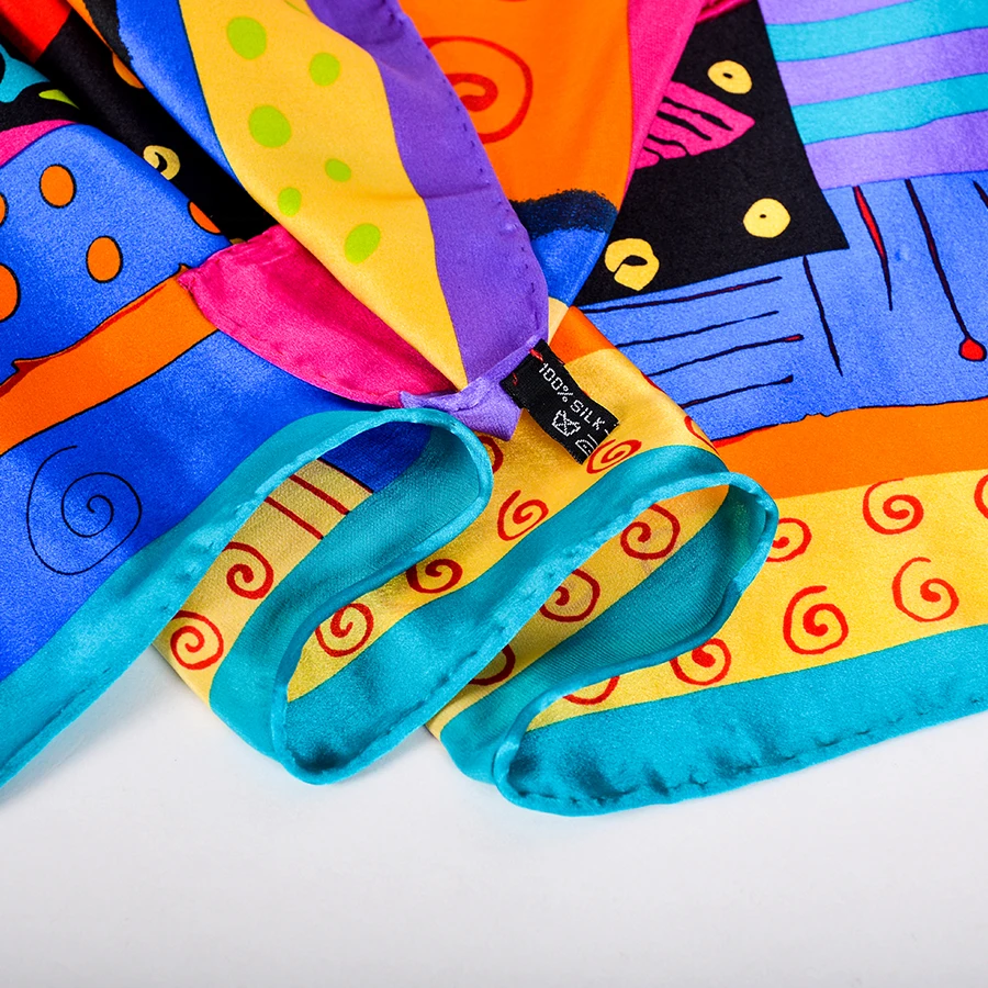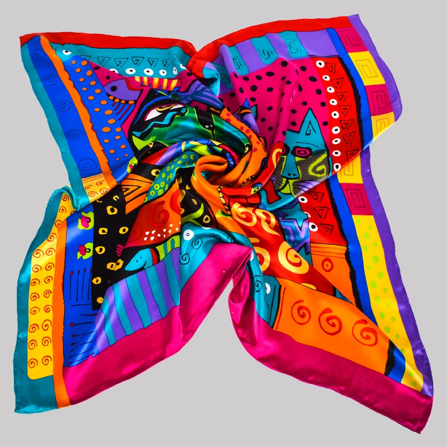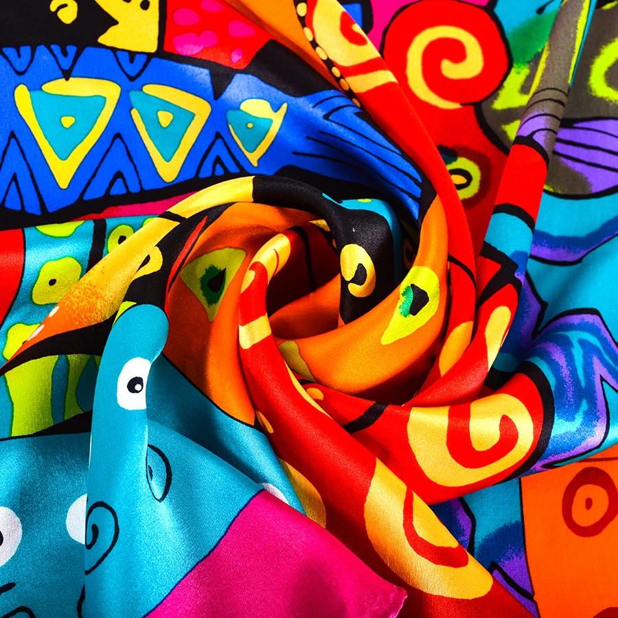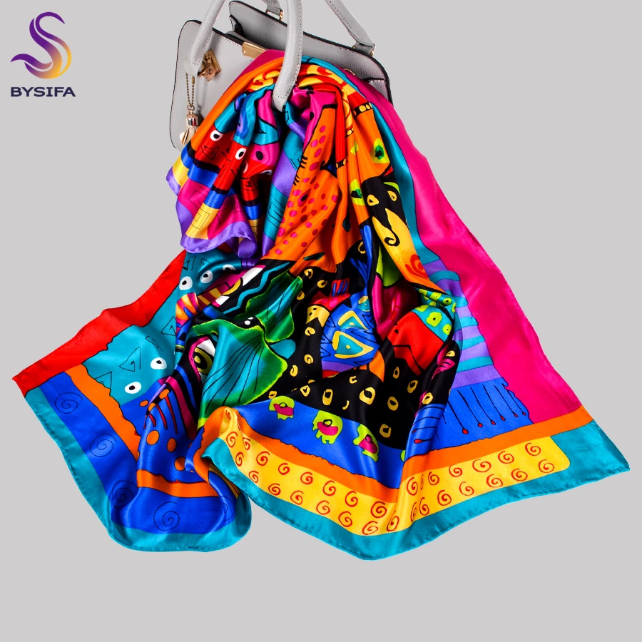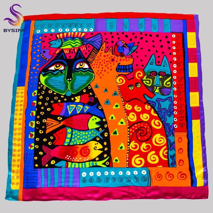 Шарф BYSIFA женский квадратный из натурального шелка, яркий мусульманский хиджаб с принтом кота и рыбы, Осень-Зима 100%, 90*90 см