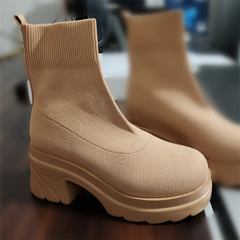 Женские вязаные эластичные ботинки на высоком каблуке, без застежки