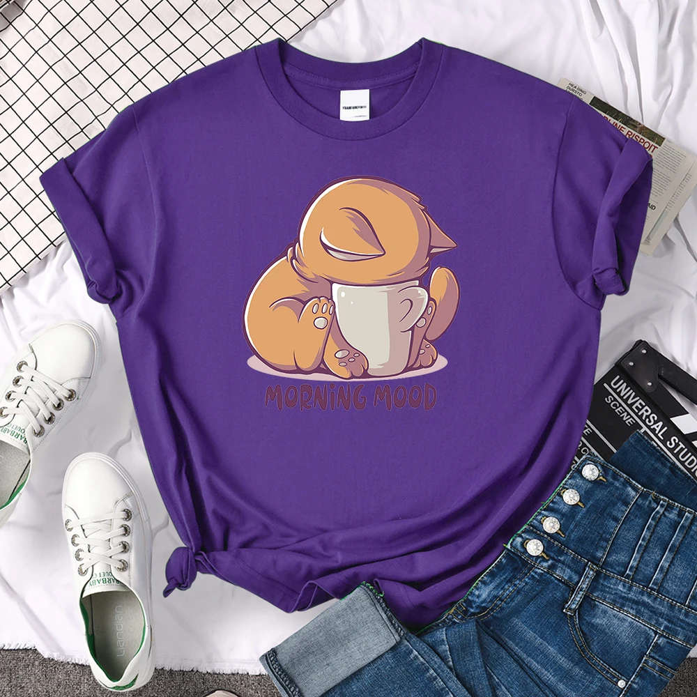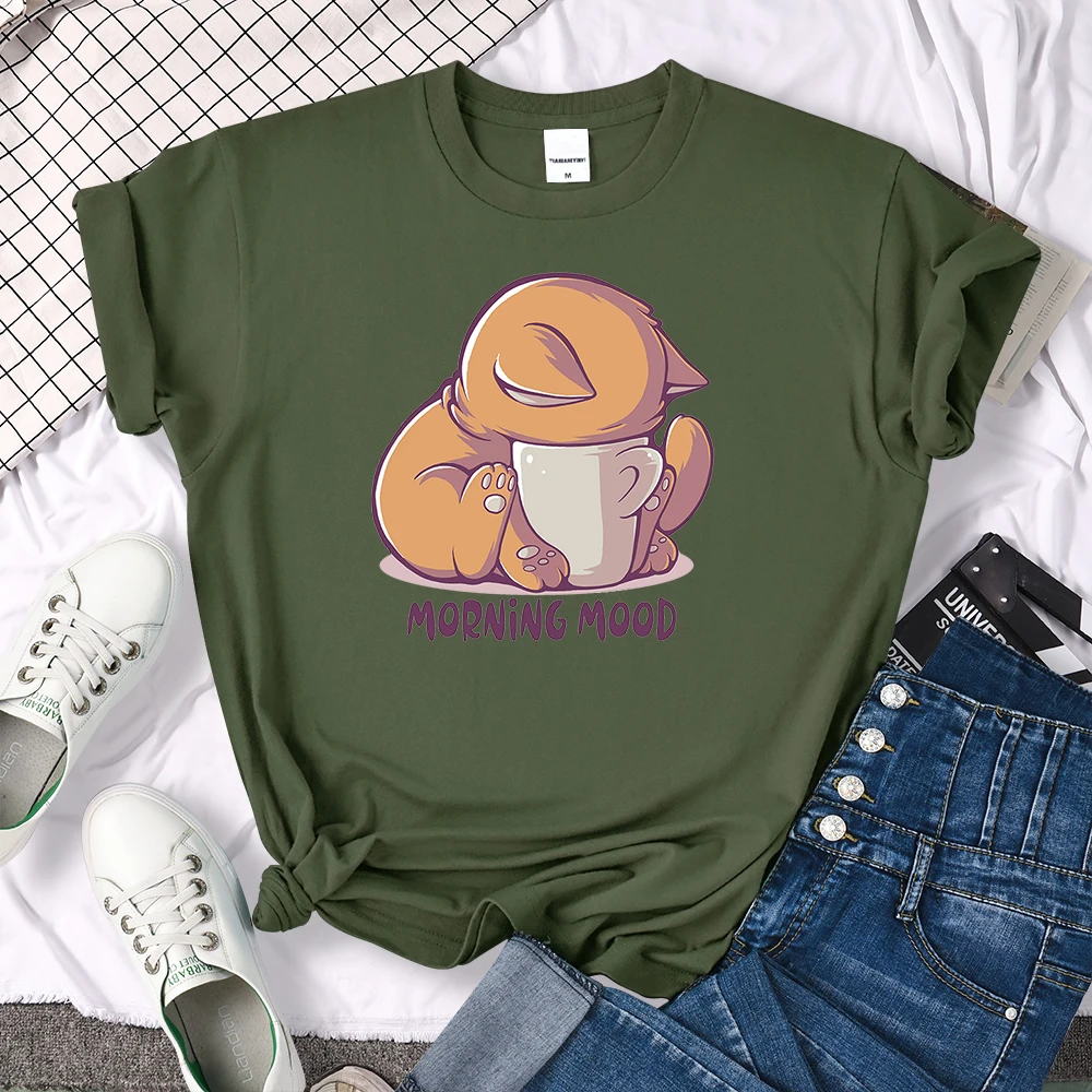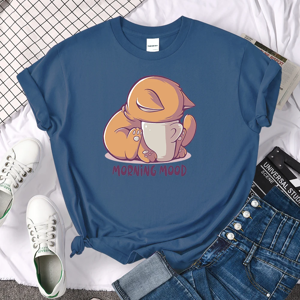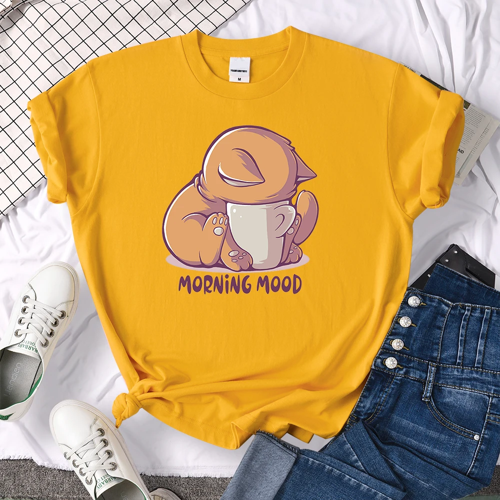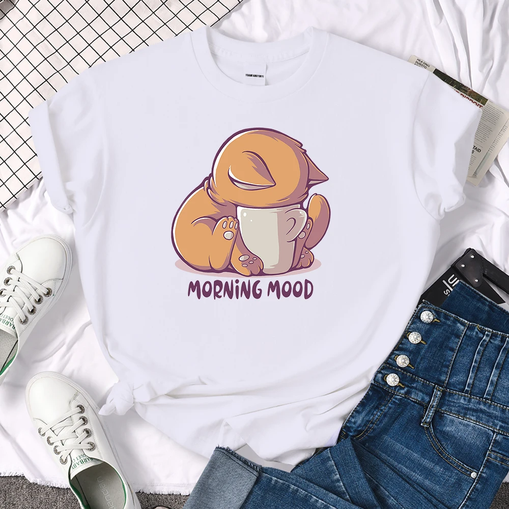 Футболки Кот смотрит на чашку Прекрасная футболка с принтом для женщин Готическая женская одежда в корейском стиле Забавная винтажная женская футболка