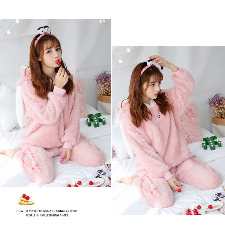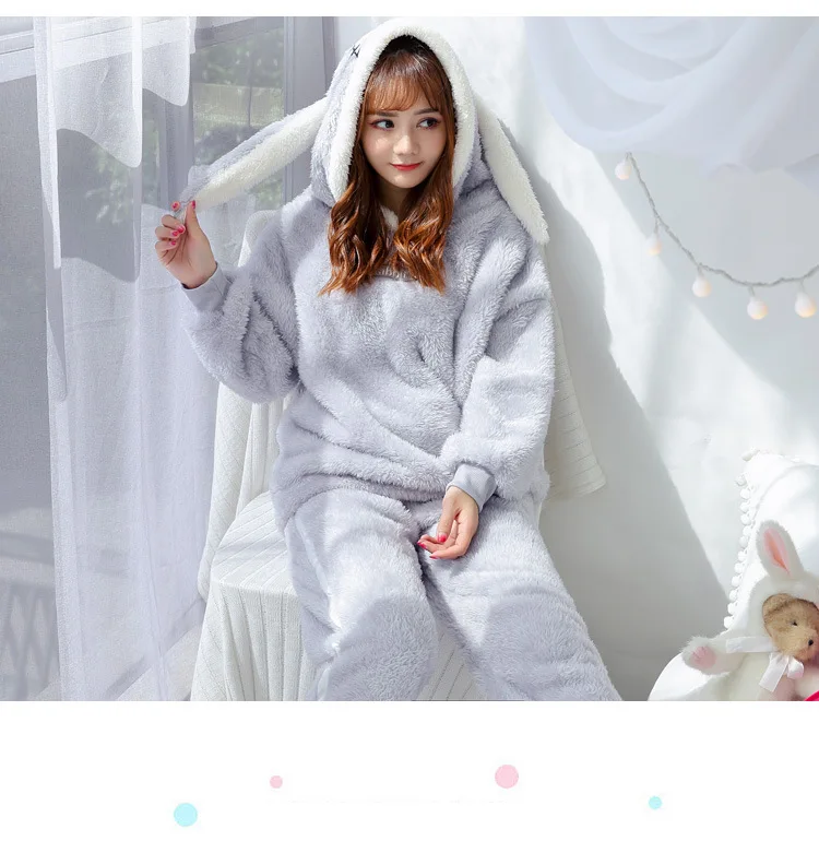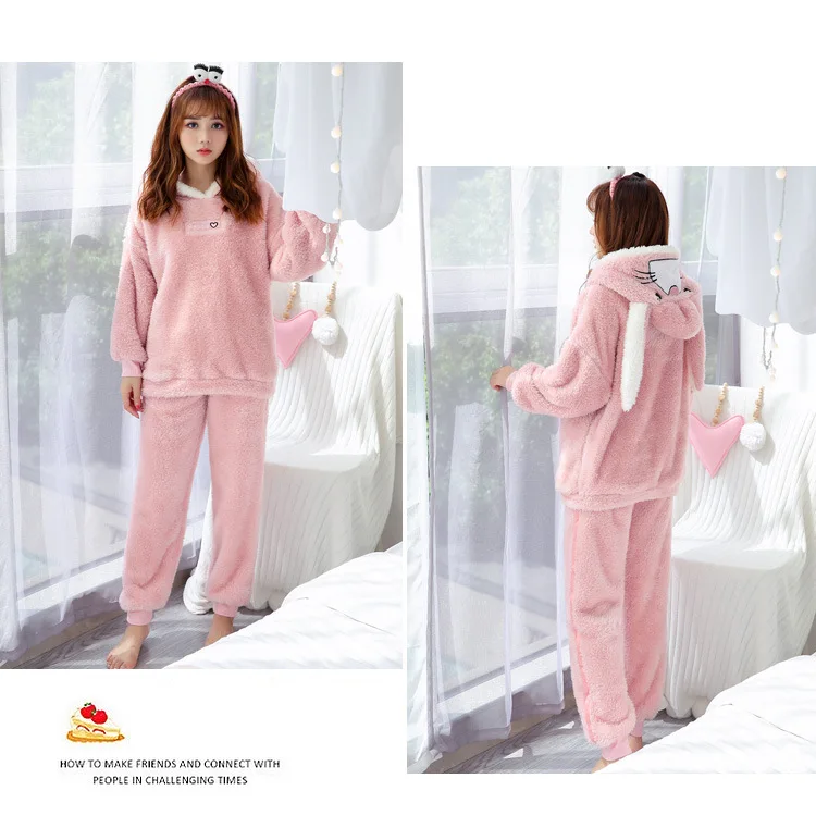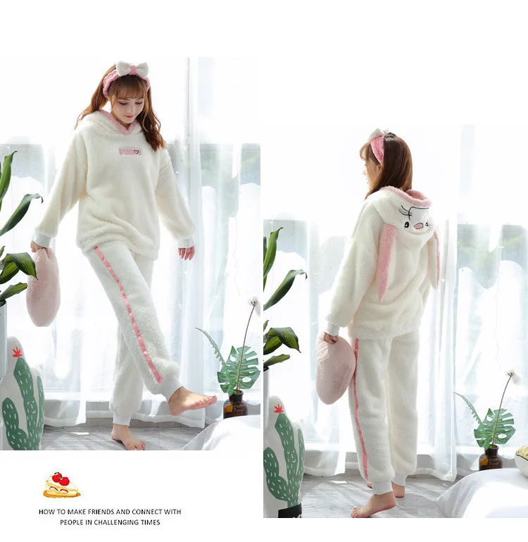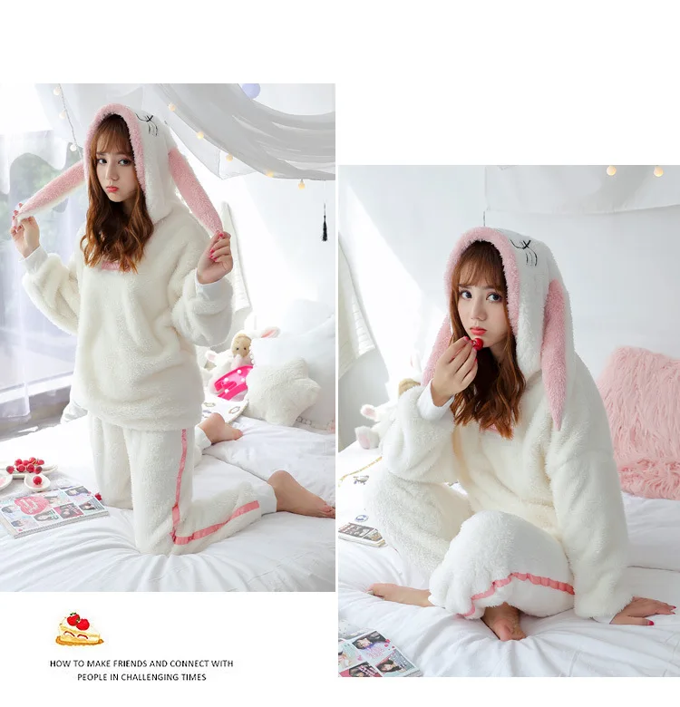 Пижама женская для взрослых, одежда для сна, милый кролик, коралловый флисовый утепленный пижамный комплект из двух предметов для девушек, ночное белье