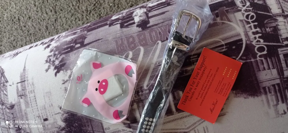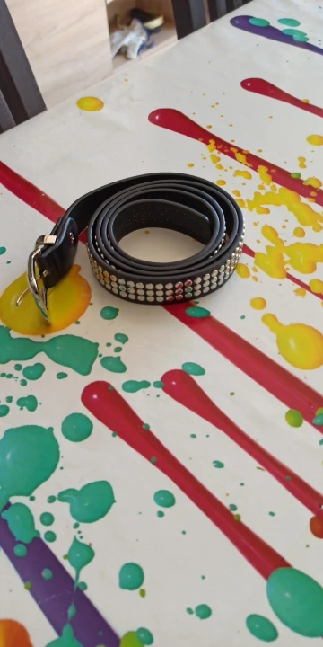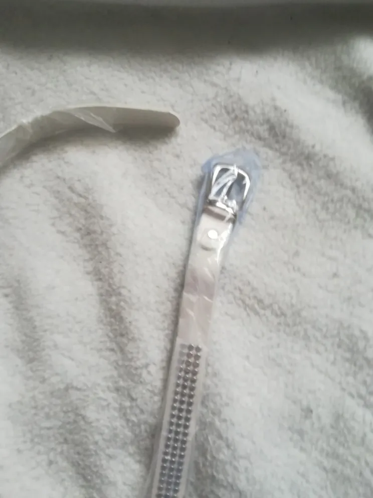 Pasek bialy z dzetami jak na zdjeciu, jeszcze nie uzywany, na zdjeciu od sprzedawcy wydawal sie bardziej bialy, niestety nie mialam możliwości wyboru koloru gratisa po wygraniu jego, mam nadzieję że jakos będzie dobra w uzytkowaniu
