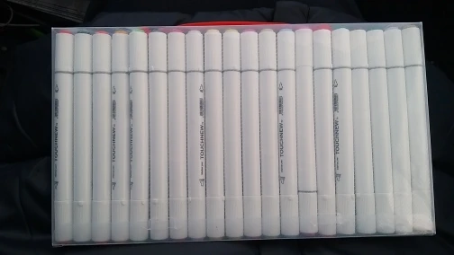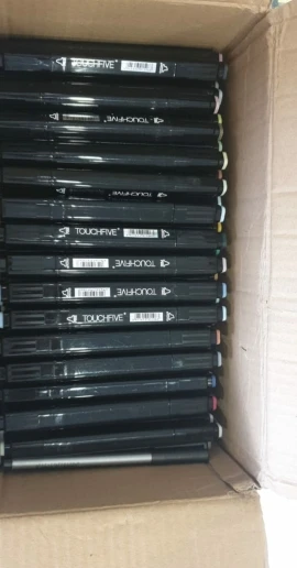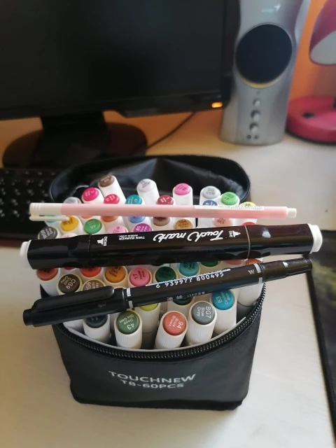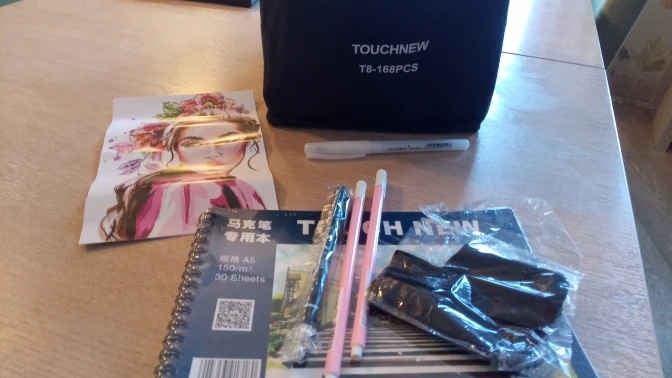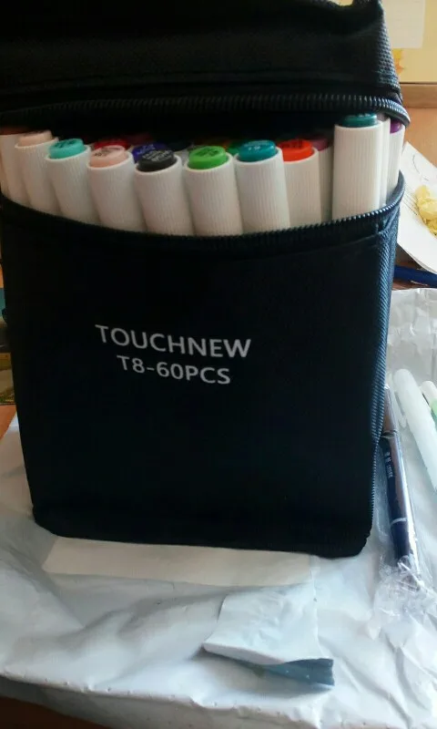 Маркеры пришли раньше ожидаемого в отличной упаковке. Хорошо ложатся на бумаге, не пахнут. Вместе с маркерами пришли подарки(двусторонний линер, две гелевые ручки, маркер touch mark, перчатка и скетч бук) Единственный изъян в моем заказе это маленькая дырочка у молнии, но это не существенно.