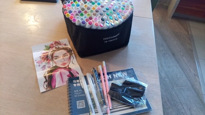 Заказала маркеры на алиэкспресс, доставка из России, приехало за 5 дней! Получила заказ, положили в подарок : черная ручка 0.5, маркер перманентный, скетчбук 30л., белая ручка. Маркеры шикарные, в хорошем качестве! Не пишет только один, но один из 80! Очень рада, что заказала именно эти маркеры, безумно много подарков, довольна заказом полностью