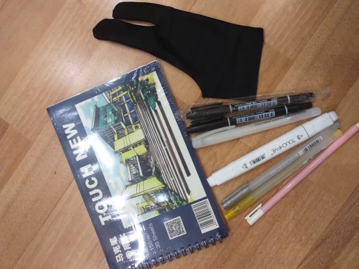 Божечки, приехали за один день с доставки от России! Все хорошо пишут, плюсом добавили пару ручек, скетчбук и перчатку! Спасибо большое! ~^^