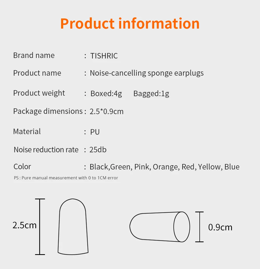 Особенность: 1. Улучшение сна, концентрации и защиты слуха 2. Применение: дом, спальня, путешествия, рабочее место и центр города 3. Плотно прилипают к внешнему слуховому каналу для изолированного шума Тип: беруши Размер: как на картинке Материал: Пена