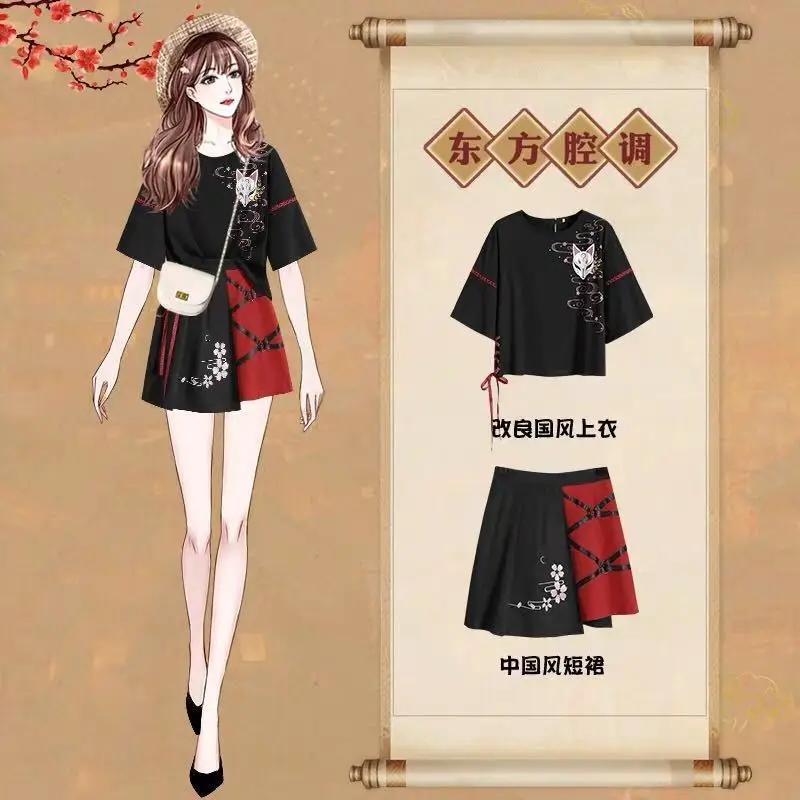 Женский летний костюм Hanfu National Wind, топ с короткими рукавами + юбка, костюм из двух предметов, японская одежда с принтом лисы