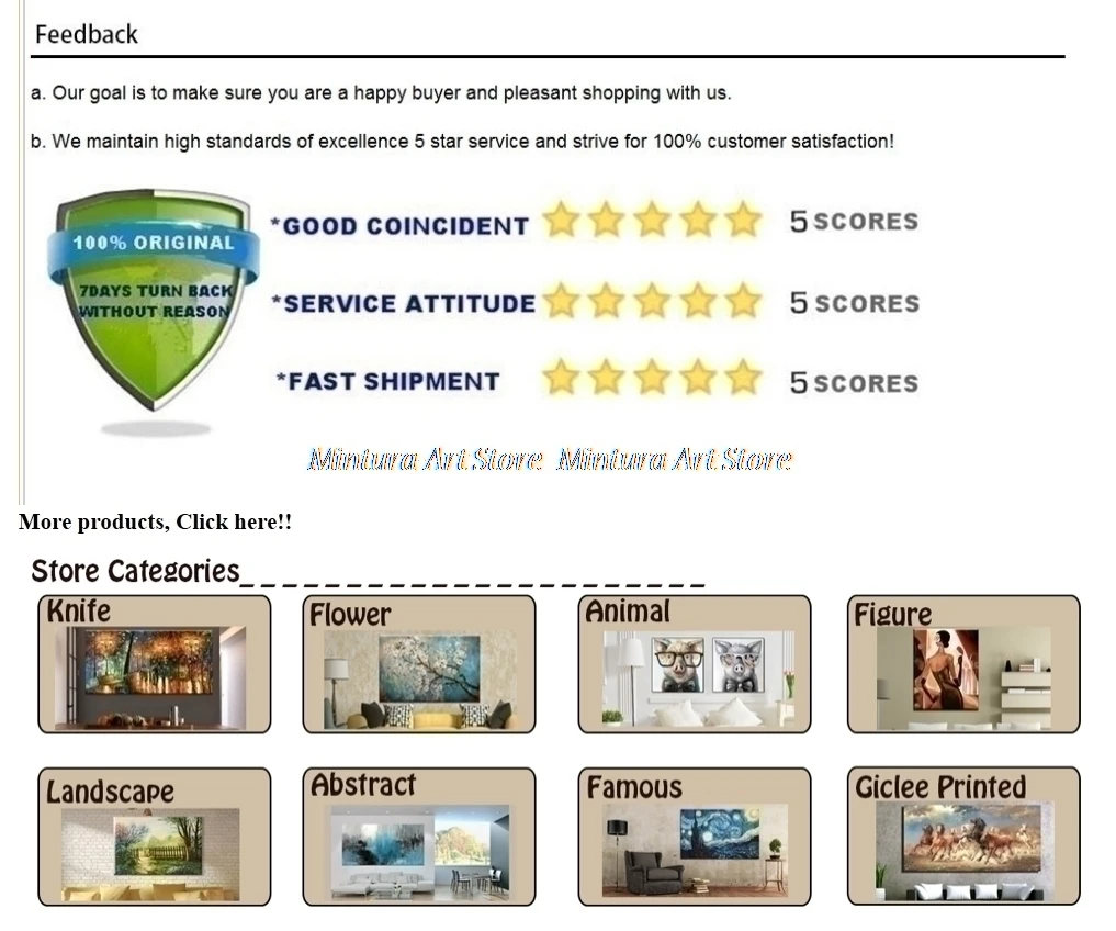 В: Что мне делать, если я не получил свою покупку? О: если вы не получили свою покупку, проявите терпение. Ваша покупка может быть доставлена вам в течение нескольких дней. Между тем, пожалуйста, свяжитесь с транспортной компанией или свяжитесь с нами для получения помощи, мы постараемся сделать все возможное, чтобы помочь вам. Если ваша покупка была утеряна, мы повторно отправим вам новый товар. В: Что мне делать, если картины, которые я купил, не понравились? О: пожалуйста, не стесняйтесь обращаться к нам через веб-почту платформы или по электронной почте, мы решим любые проблемы с вами. Мы рады помочь вам обменять другие, но покупатели несут ответственность за все транспортные расходы. В: почему у вас такие низкие цены? О: у нас много талантливых и мастер-художников, мы покупаем напрямую тысячи картин высокого качества. У нас есть Непревзойденная способность приобретать картины по низкой цене, и вместо увеличения прибыли мы передаем сбережения нашим клиентам. Покупка у нас дает вам возможность приобрести картины маслом по оптовой цене. В: так как товар нужен мне срочно, у вас есть способы доставки на ночь? О: как правило, мы отправляем картины в течение 2-7 дней после подтверждения оплаты, вы можете сообщить нам, если они вам нужны срочно, затем мы постараемся выбрать для вас ночной способ доставки. Но мы не уверены, что товар прибудет вовремя, так как международные перевозки трудно контролировать. В: вы можете настроить изображение? О: Да, если у вас есть особые пожелания, свяжитесь с нами. В: Могу ли я получить скидку? О: обычно у нас есть скидки каждые несколько месяцев, вы можете поместить понравившиеся товары в корзину и Добавить в список желаний, подождите, пока система проинформирует Вас о скидке. В: вы предлагаете оптовую цену? О: Да, если вы хотите заказать много штук вместе, вы можете связаться с нами, и мы проверим, какую скидку мы можем предложить.